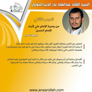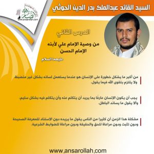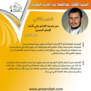 مقتطفات من الدرس الثاني للسيد القائد عبدالملك بدر الدين الحوثي من وصية الإمام علي لأبنه الحسن عليهما السلام يونيو 20, 2023 FacebookTwitterTelegramWhatsApp