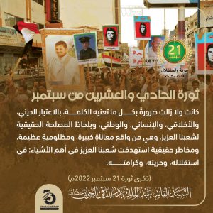 ثورة الـ21 سبتمبر كانت ولا زالت ضرورة بكل ما تعنية الكلمة بالاعتبار الديني،والأخلاقي،والإنساني،والوطني سبتمبر 15, 2023 FacebookTwitterTelegramWhatsApp