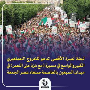 🔴لجنة نصرة الأقصى تدعو للخروج الجماهيري الكبير والواسع في مسيرة(مع غزة حتى النصر)في #ميدان_السبعين بالعاصمة #صنعاء عصر الجمعة #طوفان_الأقصى #لستم_وحدكم #اليمن_سند_فلسطين ديسمبر 13, 2023 FacebookTwitterTelegramWhatsApp
