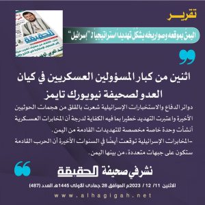 🔴تقرير | 5️⃣1️⃣ اليمن بموقعه وصواريخه يشكل تهديداًاستراتيجياً لإسرائيل #صحيفة_الحقيقة ديسمبر 18, 2023 FacebookTwitterTelegramWhatsApp