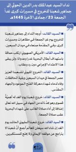 🔴 إنفوجرافيك| نداء السيد عبدالملك بدر الدين الحوثي إلى جماهير شعبنا للخروج في مسيرات كبرى غداً الجمعة 23 جمادى الآخرة 1445هـ يناير 4, 2024 FacebookTwitterTelegramWhatsApp