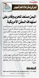🔴 متابعات | اليمن في وسائل إعلام العدو الصهيوني #صحيفة_الحقيقة يناير 7, 2024 FacebookTwitterTelegramWhatsApp