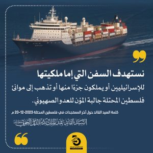 🔴نستهدف السفن التي يملكها إسرائيليون أو يملكون جزءًا منها أو تجلب المؤن للعدو الصهيوني يناير 14, 2024 FacebookTwitterTelegramWhatsApp