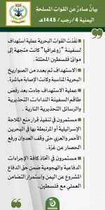 بيان القوات المسلحة اليمنية 4 رجب 1445هـ #معركة_الفتح_الموعود_والجهاد_المقدس يناير 16, 2024 FacebookTwitterTelegramWhatsApp