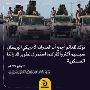 🔴نؤكد للعالم أجمع أن العدوان الأمريكي البريطاني سيسهم أكثر وأكثر كلما استمر في تطوير قدراتنا العسكرية فبراير 3, 2024 FacebookTwitterTelegramWhatsApp