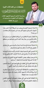 🟢إنفوجرافيك 1️⃣1️⃣ مقتطفات من كلمة قائد الثورة السيد عبدالملك بدرالدين الحوثي، بمناسبة الذكرى السنوية للشهيد القائد 1445هـ فبراير 6, 2024 FacebookTwitterTelegramWhatsApp
