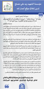 🔴إدانة مؤسسة الشهيد زيد علي مصلح إغلاق موقع أنصار الله فبراير 12, 2024 FacebookTwitterTelegramWhatsApp
