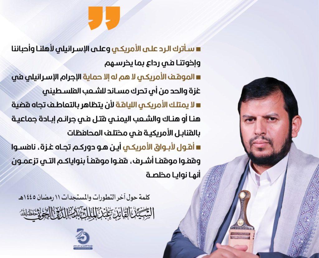 إنفو جرافيك| أبرز ما ورد في كلمة السيد القائد / عبدالملك بدر الدين الحوثي حول أخر التطورات والمستجدات 11 رمضان 1445هـ|21مارس2024م مارس 21, 2024 FacebookTwitterTelegramWhatsApp