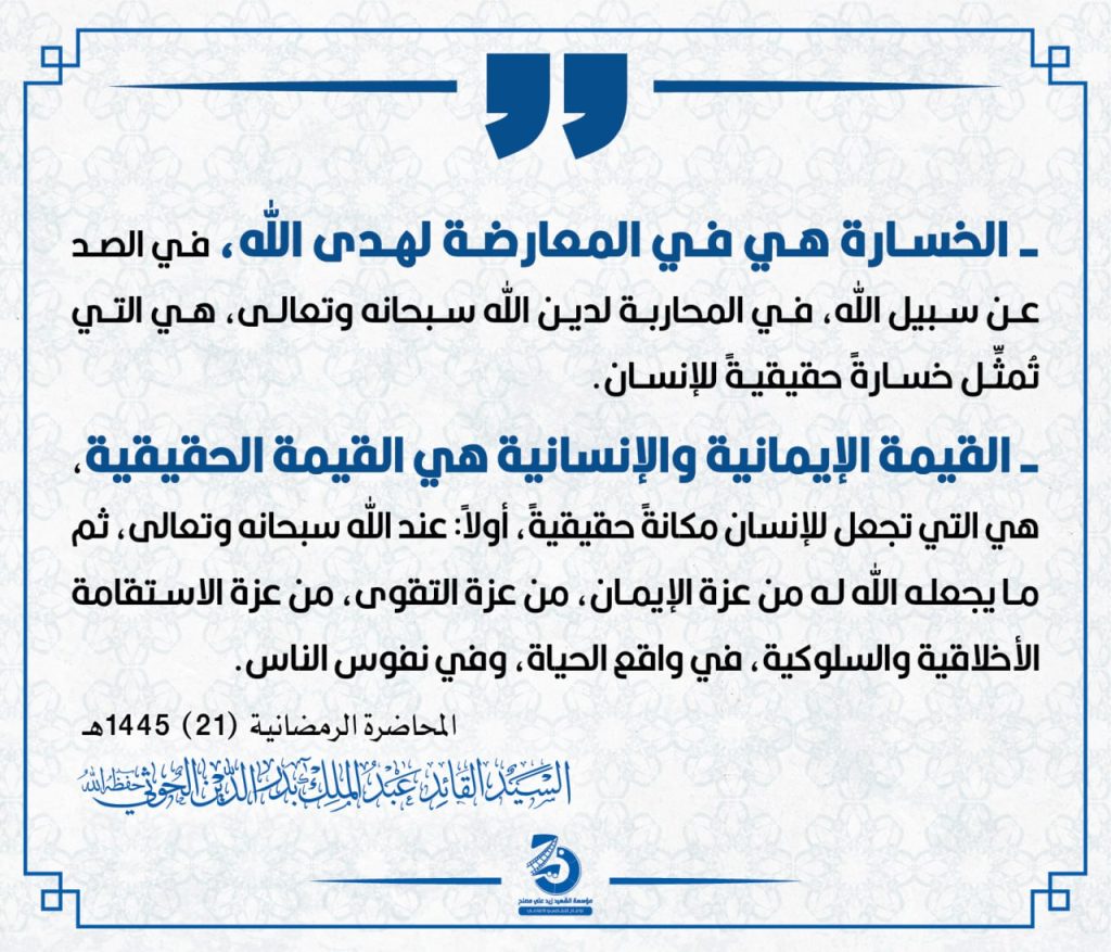إنفو جرافيك| مقتطفات من المحاضرة الرمضانية الحادية والعشرين للسيد القائد عبدالملك بدر الدين الحوثي (يحفظه الله) 26 رمضان 1445هـ أبريل 5, 2024 FacebookTwitterTelegramWhatsApp