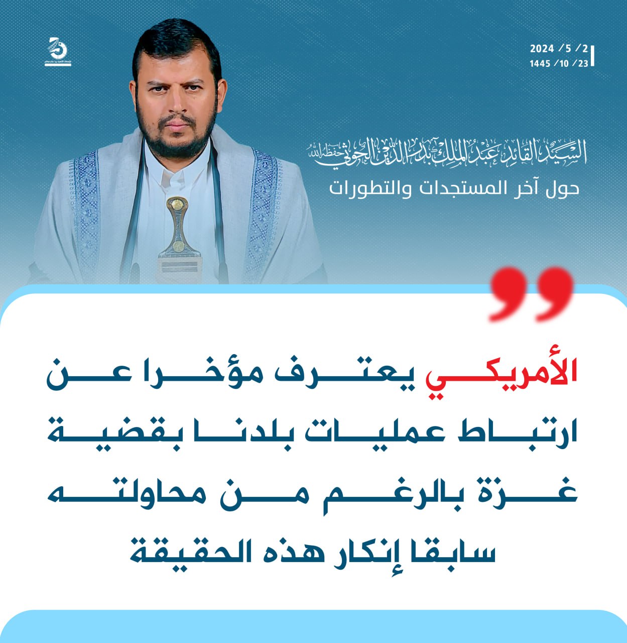 Return to "إنفو جرافيك | مقتطفات من كلمة السيد القائد عبدالملك بدر الدين الحوثي حول آخر التطورات في فلسطين…" الأمريكي يعترف مؤخرا عن ارتباط عمليات بلدنا بقضية غزة بالرغم من محاولته سابقا إنكار هذه الحقيقة التالي السابق