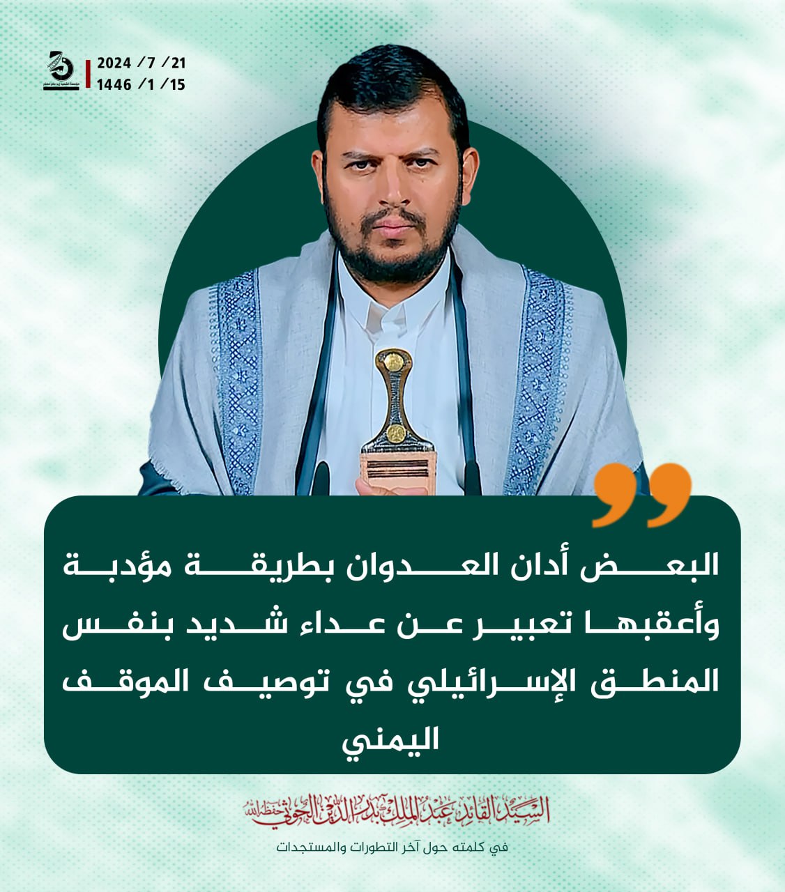 Return to "إنفو جرافيك | متقطفات من كلمة السيد القائد عبدالملك بدر الدين الحوثي (يحفظه الله) حول آخر التطورات…" البعض أدان العدوان بطريقة مؤدبة وأعقبها تعبير عن عداء شديد بنفس المنطق الإسرائيلي في توصيف الموقف اليمني التالي السابق