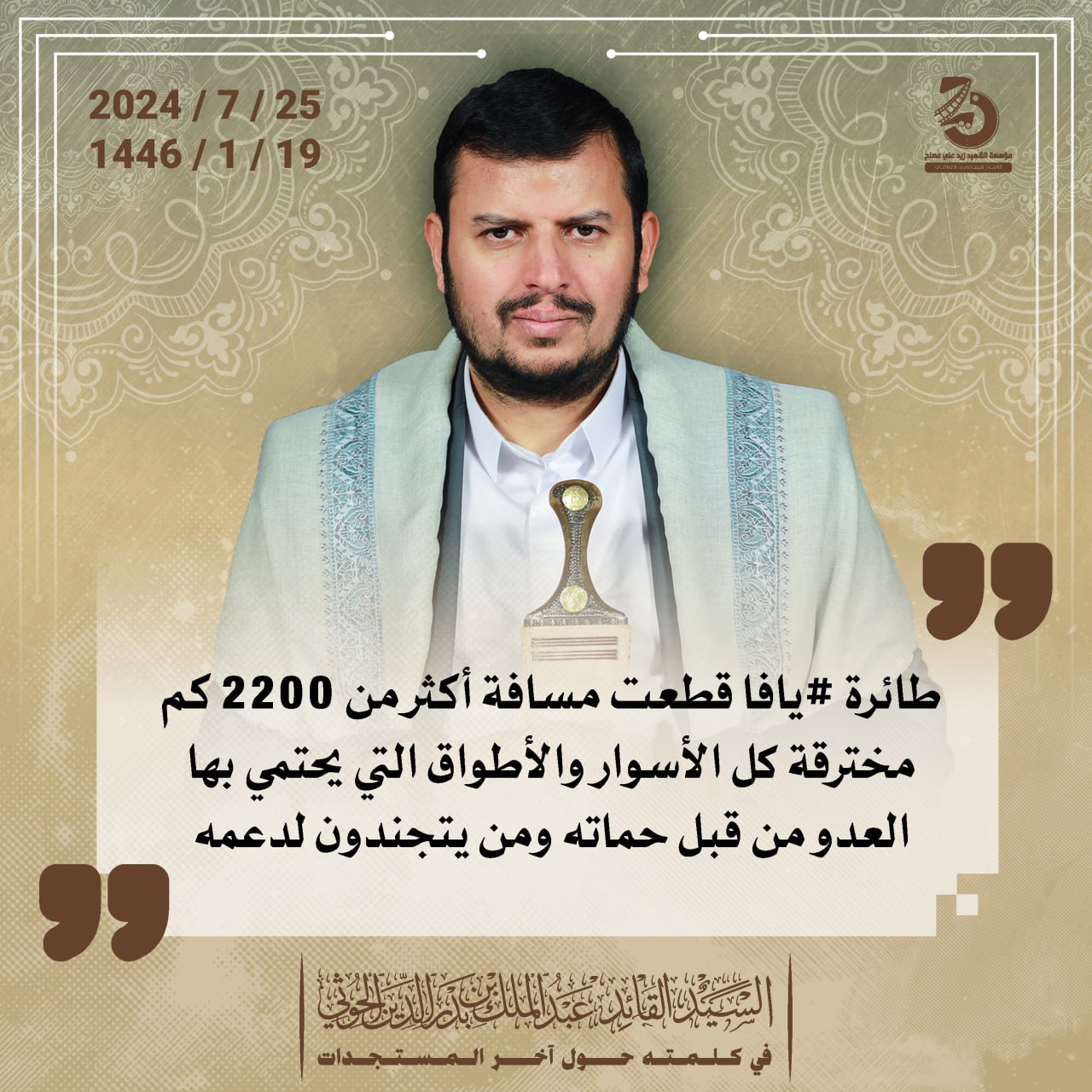 Return to "إنفو جرافيك | مقتطفات من كلمة السيد القائد عبدالملك بدرالدين الحوثي (يحفظه الله) حول آخر التطورات…" طائرة #يافا قطعت مسافة أكثر من 2200 كم مخترقة كل الأسوار والأطواق التي يحتمي بها العدو من قبل حماته ومن يتجندون لدعمه التالي السابق