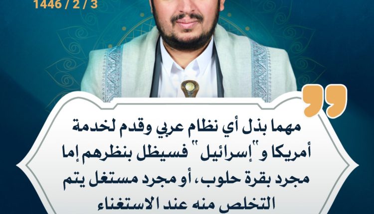 Return to "إنفو جرافيك | مقتطفات من كلمة السيد القائد عبدالملك بدرالدين الحوثي حول تطورات العدوان الإسرائيلي…" مهما بذل أي نظام عربي وقدم لخدمة أمريكا وإسرائيلفسيظل بنظرهم إما مجرد بقرة حلوب، أو مجرد مستغل يتم التخلص منه عند الاستغناء التالي السابق