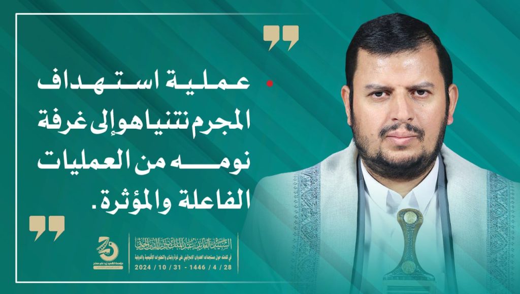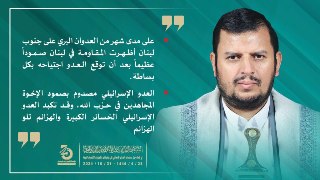 إنفو جرافيك | مقتطفات من كلمة السيد القائد عبدالملك بدر الدين الحوثي حول مستجدات العدوان الإسرائيلي على غزة و لبنان والتطورات الإقليمية والدولية 28 ربيع الآخر 1446هـ | 31 أكتوبر 2024م أكتوبر 31, 2024 FacebookTwitterTelegramWhatsApp