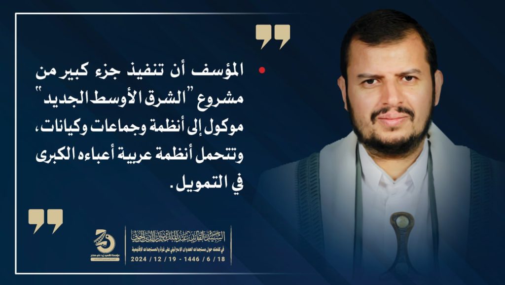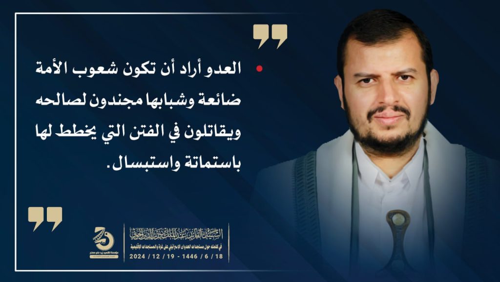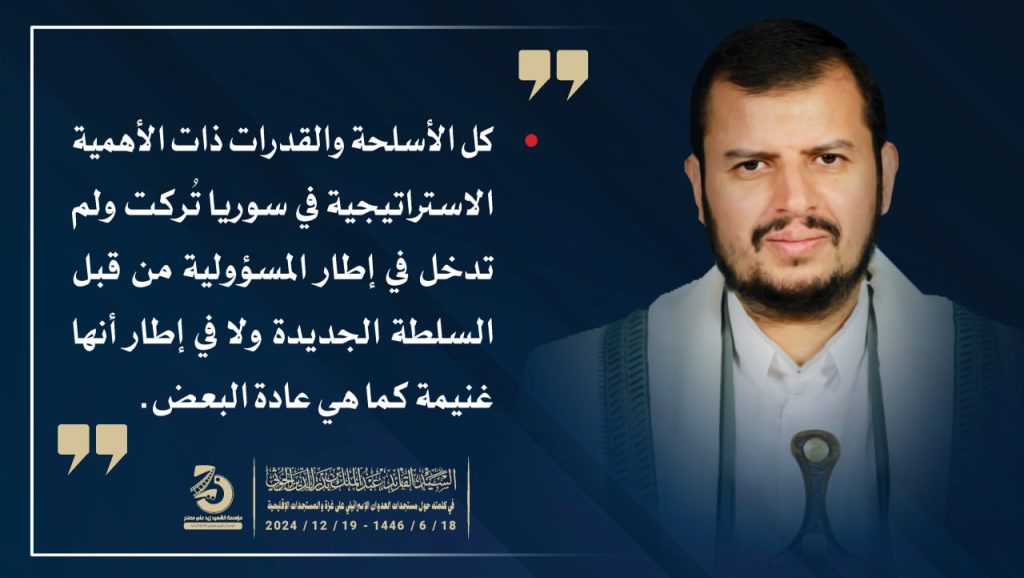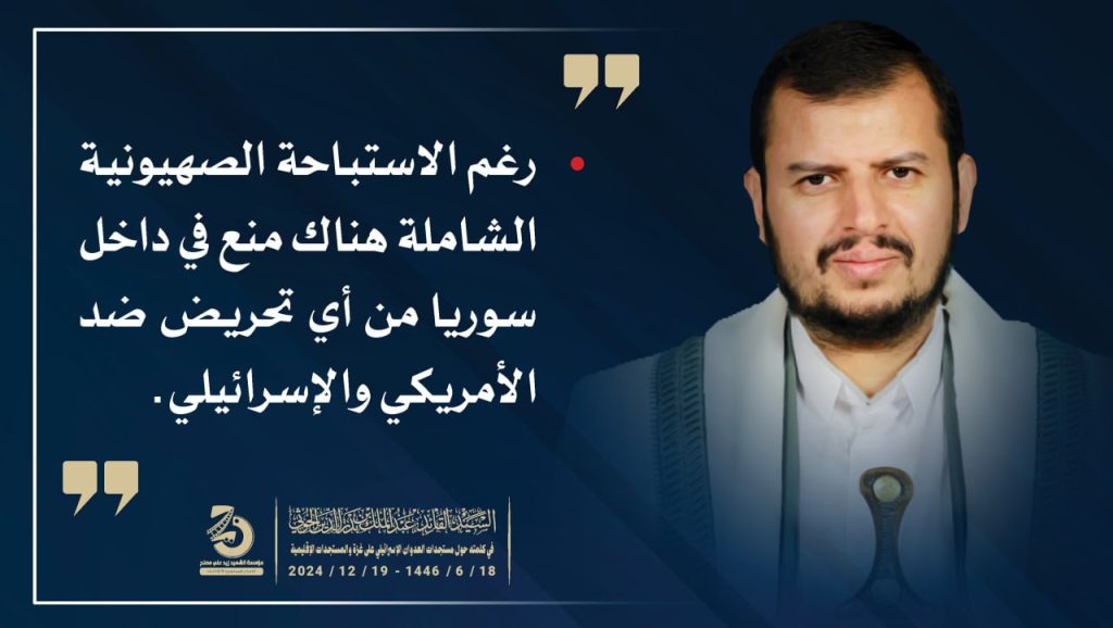 إنفو جرافيك | مقتطفات من كلمة السيد القائد عبدالملك بدر الدين الحوثي يحفظه الله حول مستجدات العدوان الإسرائيلي على غزة وآخر التطورات الإقليمية والدولية 18جمادى الآخر 1446هـ | 19 ديسمبر 2024م ديسمبر 19, 2024 إسرائيلالسيد عبدالملك الحوثيطوفان نحو التحريرغزةلستم وحدكممحور المقاومة FacebookTwitterTelegramWhatsApp