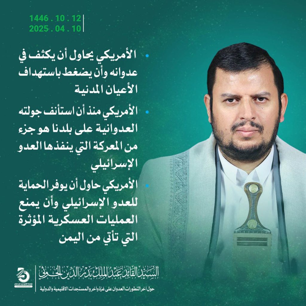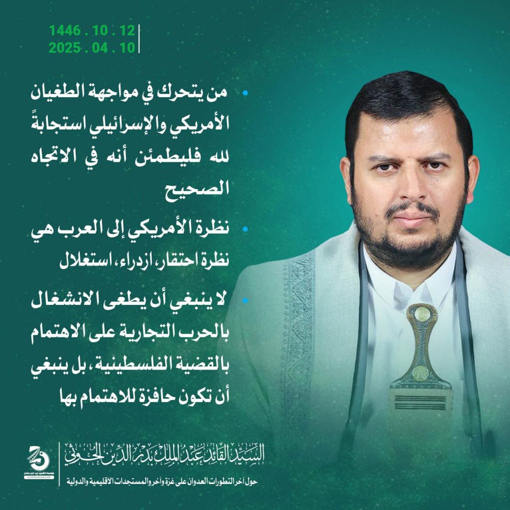 إنفو جرافيك | أبرز المقتطفات في كلمة السيد القائد عبدالملك بدرالدين الحوثي (يحفظه الله ) حول آخر تطورات العدوان على غزة وآخر المستجدات الإقليمية والدولية. 12 شوال 1446هـ | 10 أبريل 2025م #سيد_القول_والفعل #التصعيد_بالتصعيد #لن_نترك_غزة أبريل 10, 2025 أمريكاإسرائيلالتصعيد بالتصعيدطوفان نحو التحريرغزةلستم وحدكملن نترك غزة FacebookTwitterTelegramWhatsApp