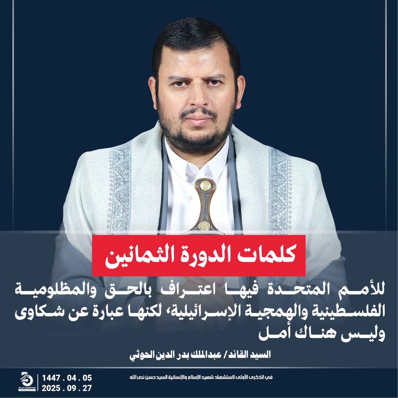 Return to "مقتطفات من كلمة السيد القائد عبدالملك بدرالدين الحوثي في الذكرى الأولى لاستشهاد شهيد الإسلام…" 13 التالي السابق