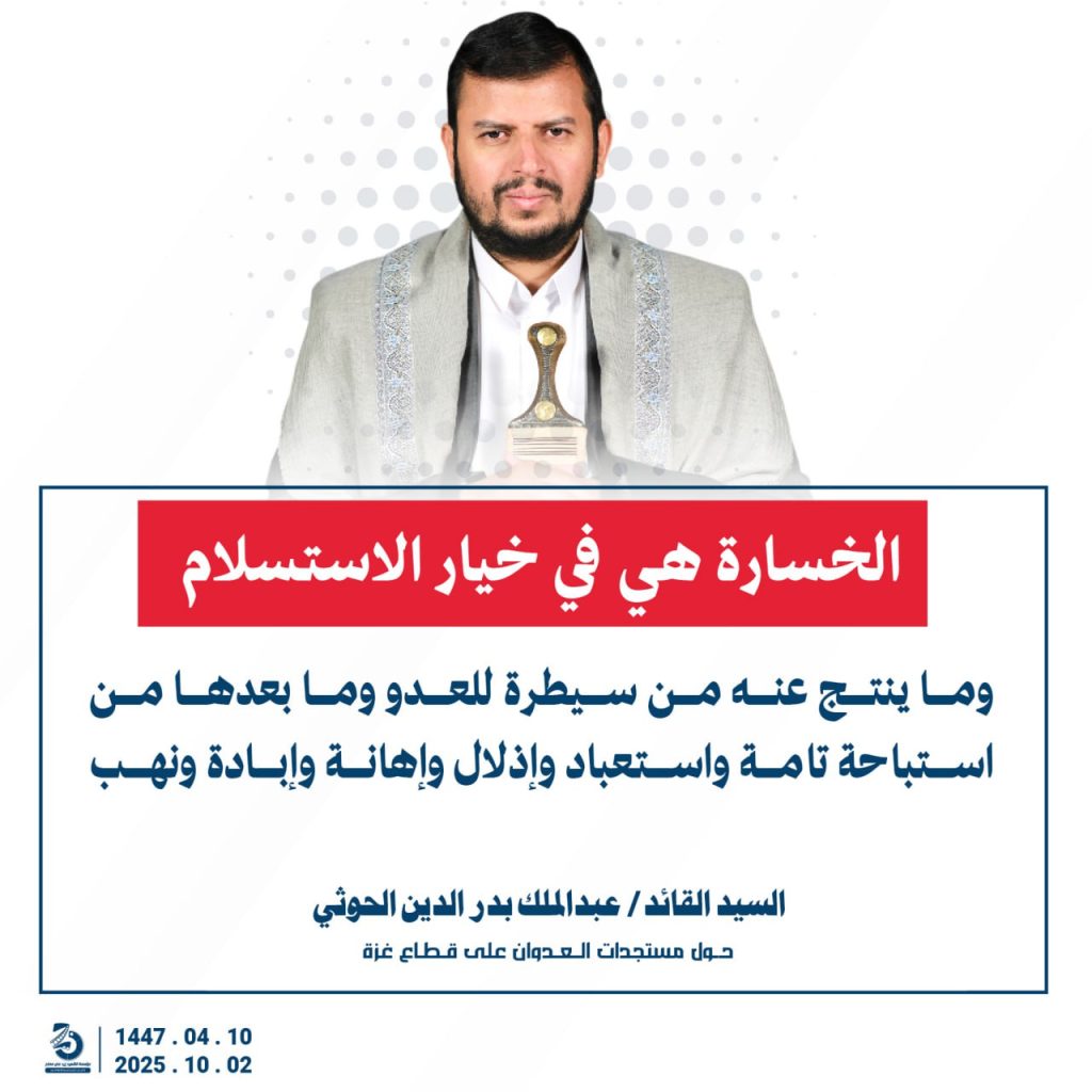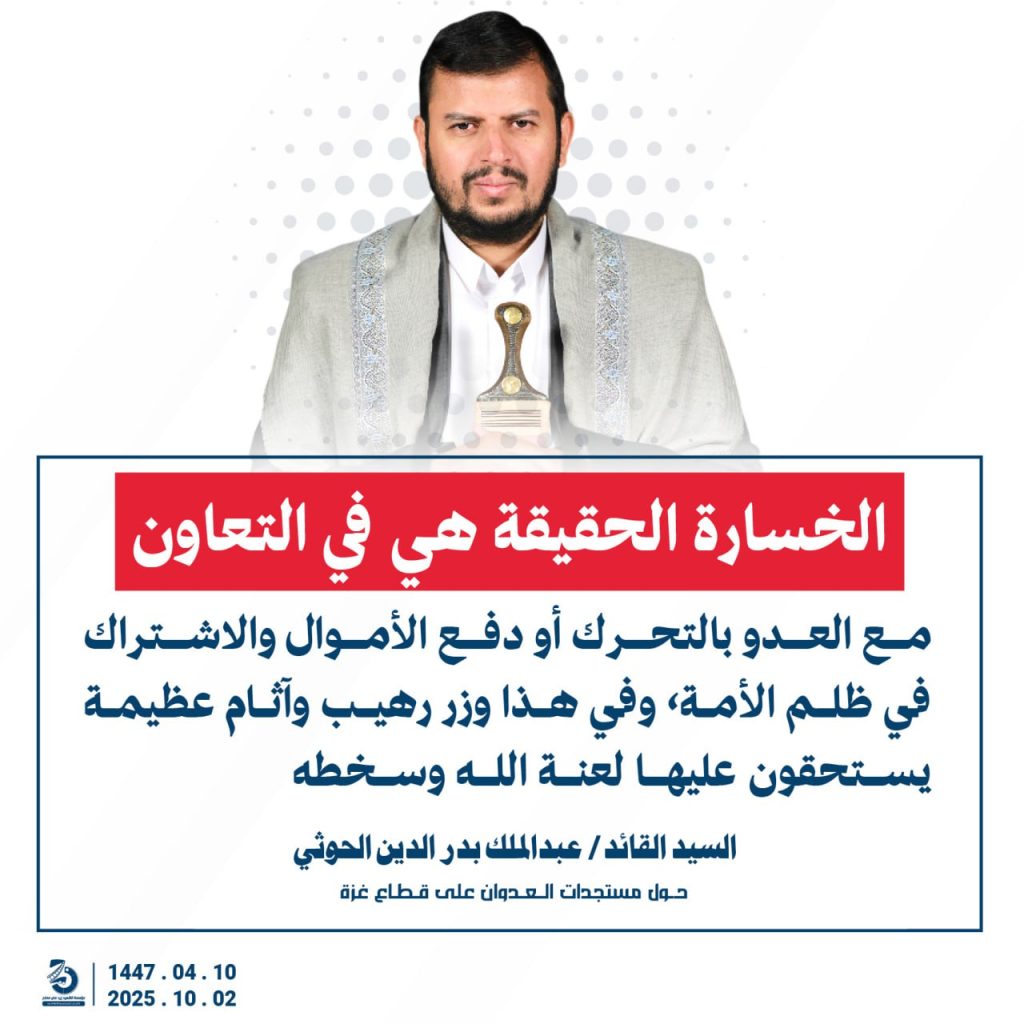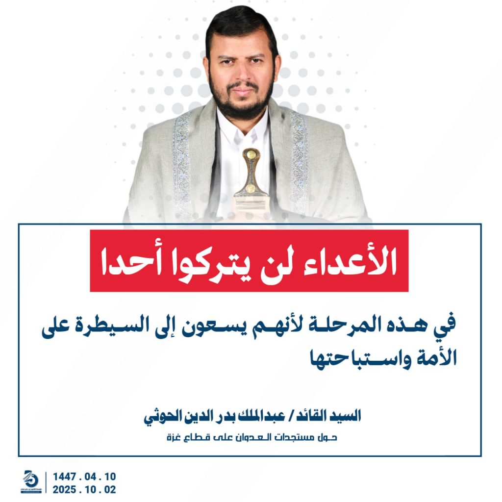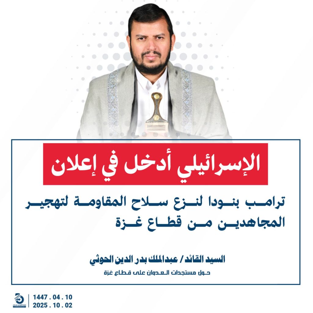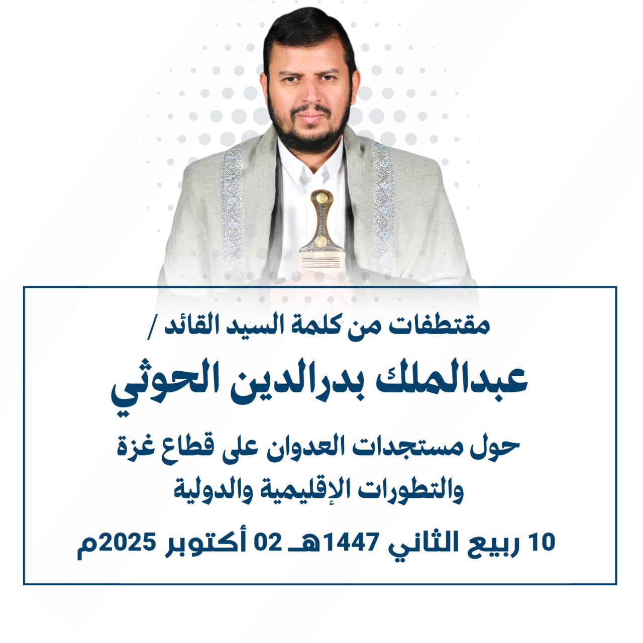 Image مقتطفات من كلمة السيد القائد عبدالملك بدرالدين الحوثي حول مستجدات العدوان على قطاع غزة والتطورات الإقليمية والدولية 10 ربيع الثاني 1447هـ 02 أكتوبر 2025م أكتوبر 2, 2025 العدو الاسرائيلياليمنامريكاغزةفلسطينلستم وحدكممعادلة الاستباحة FacebookTwitterTelegramWhatsApp