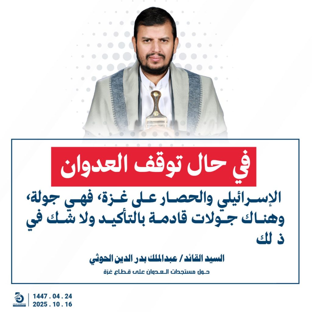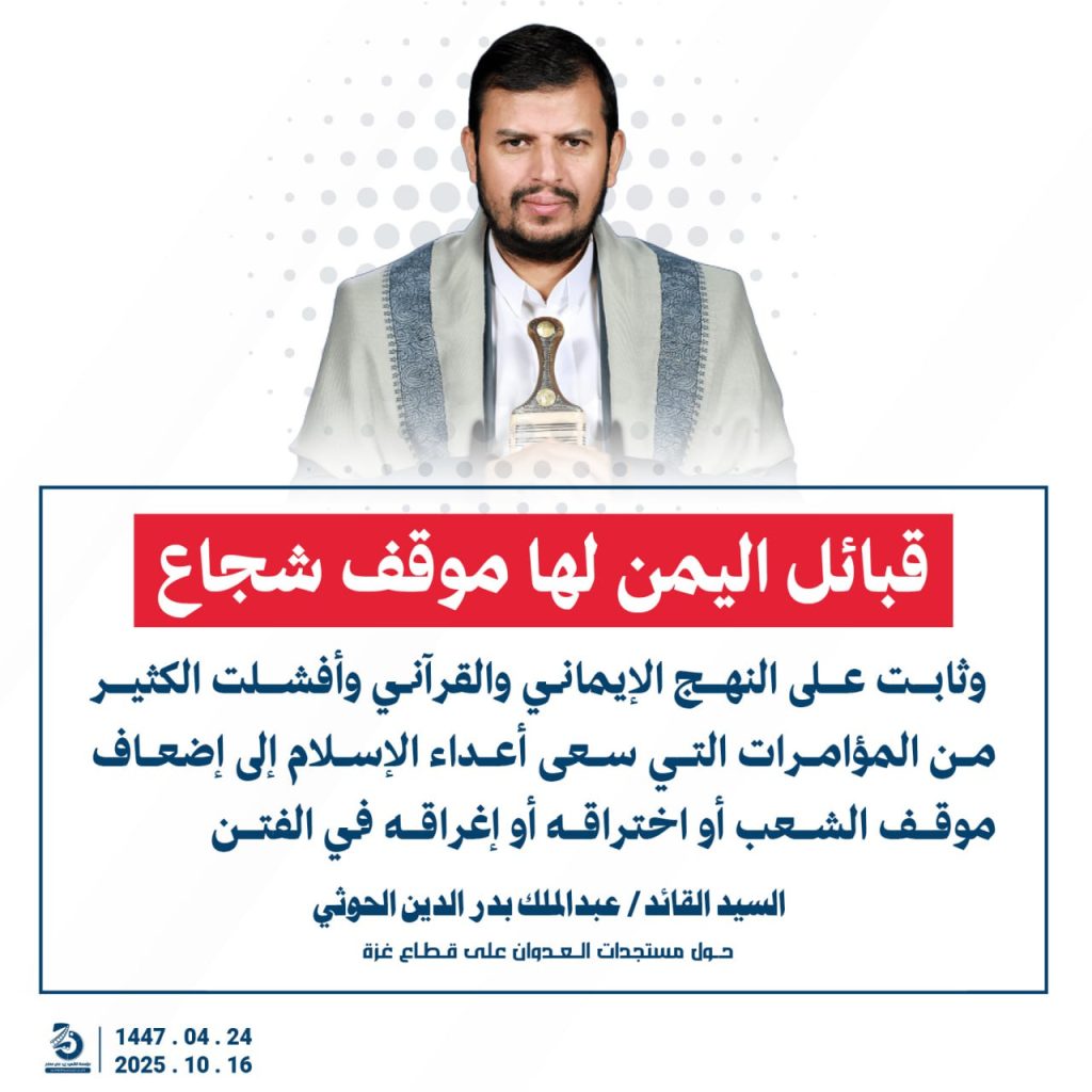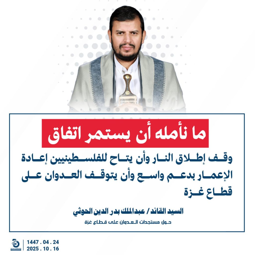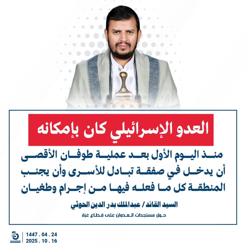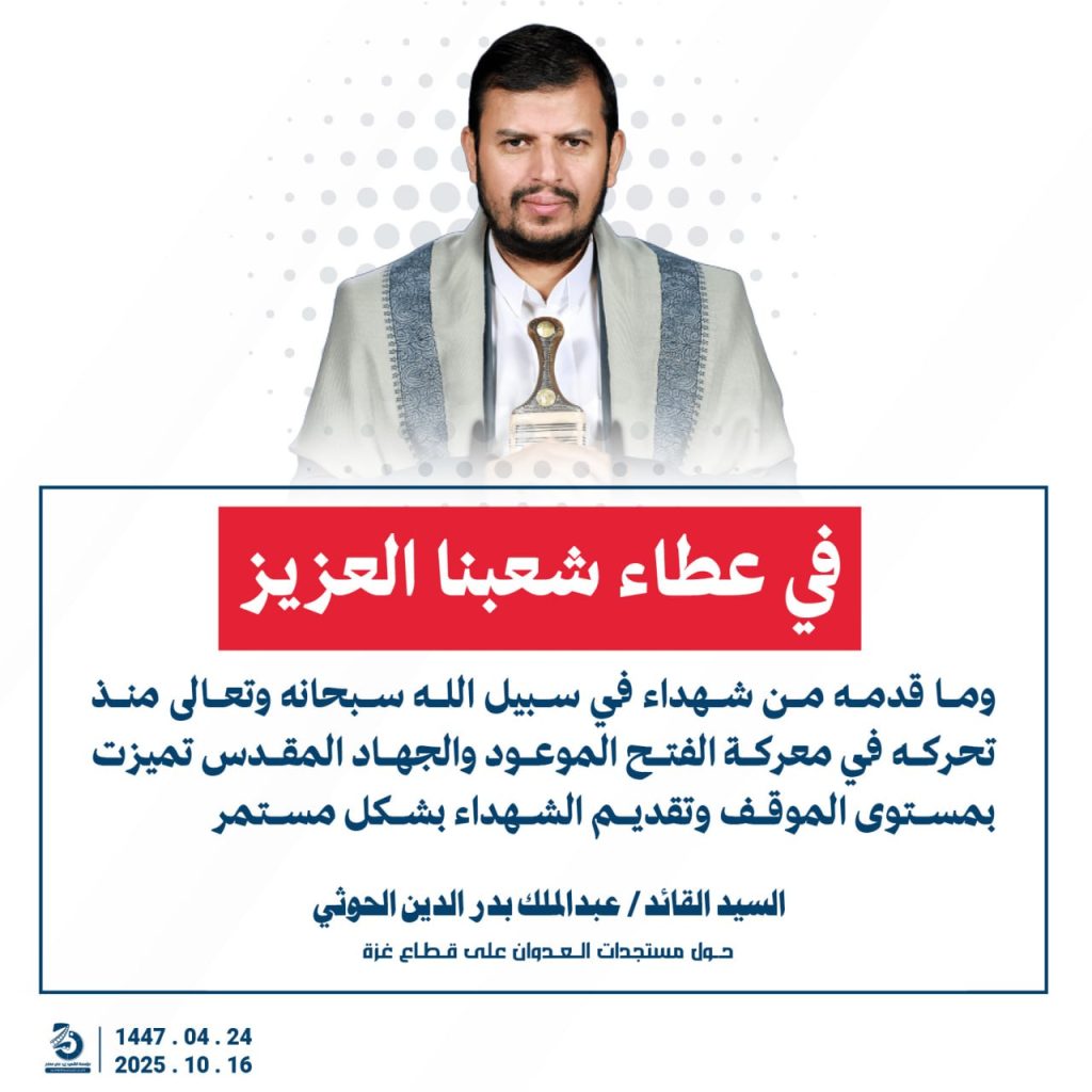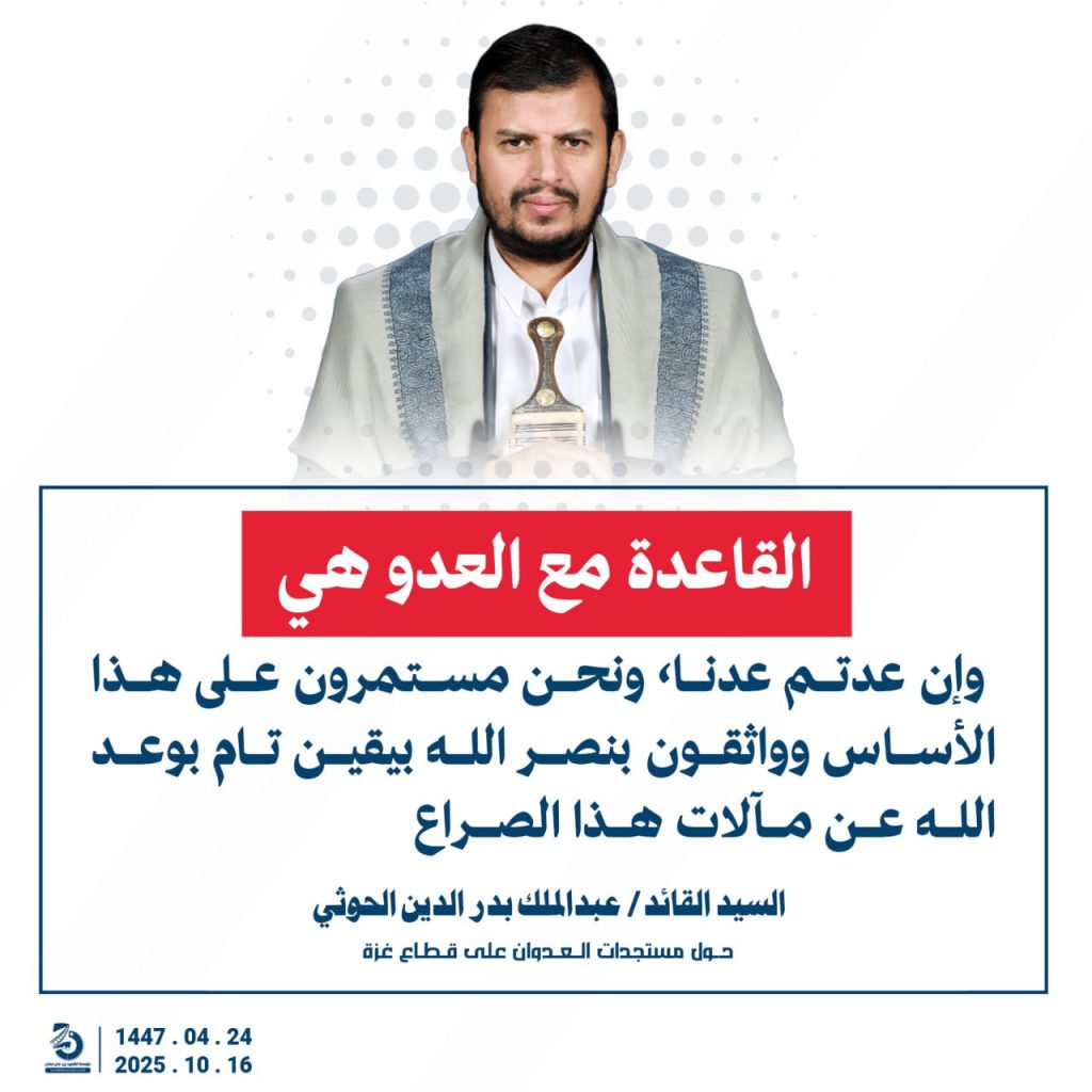 مقتطفات من كلمة السيد القائد عبدالملك بدرالدين الحوثي “حفظه الله”حول المستجدات في قطاع غزة والتطورات الاقليمية والدولية 24 ربيع الآخر 1447هـ | 16 أكتوبر 2025م