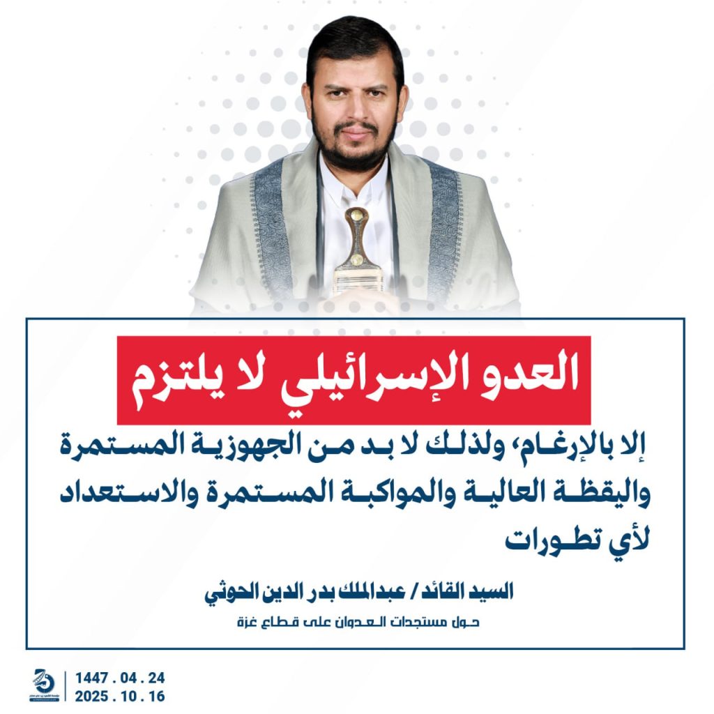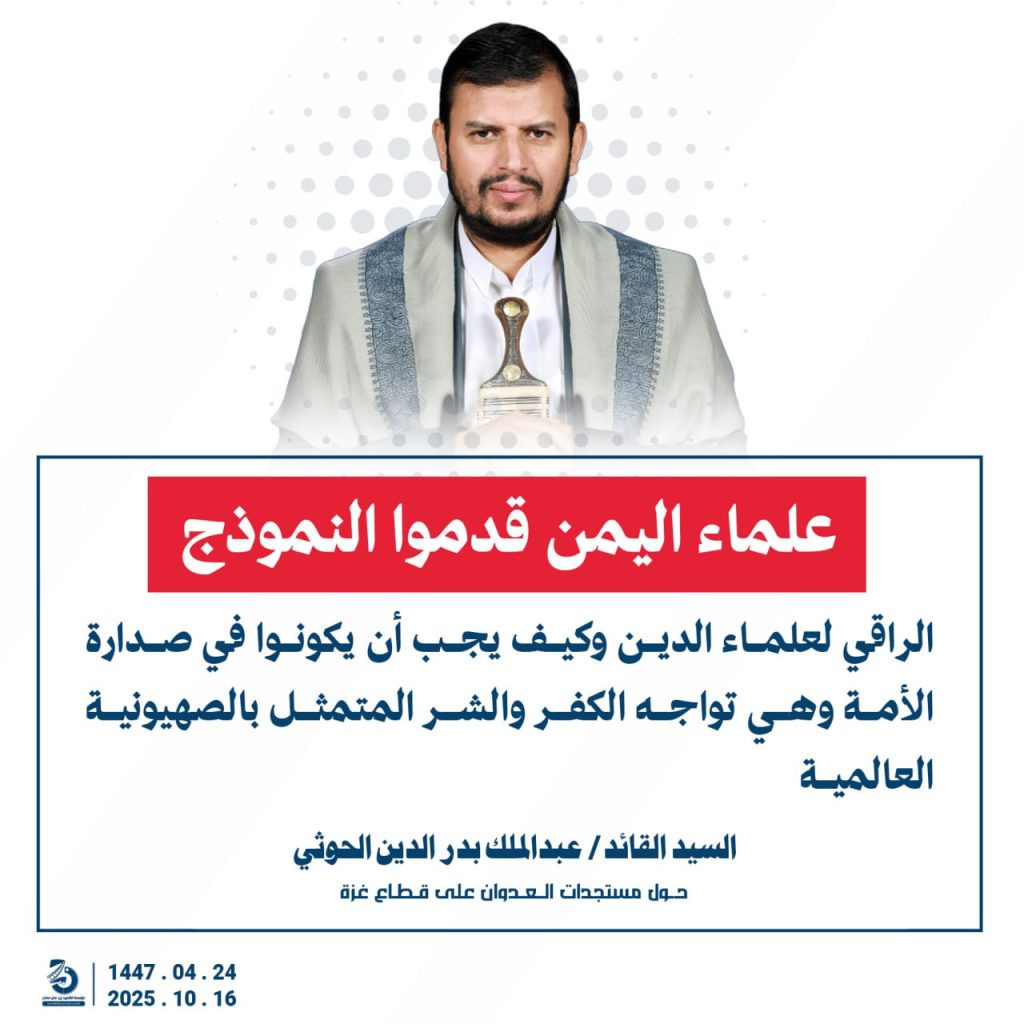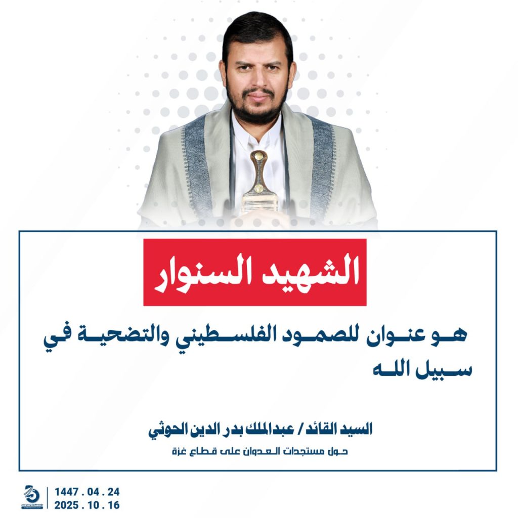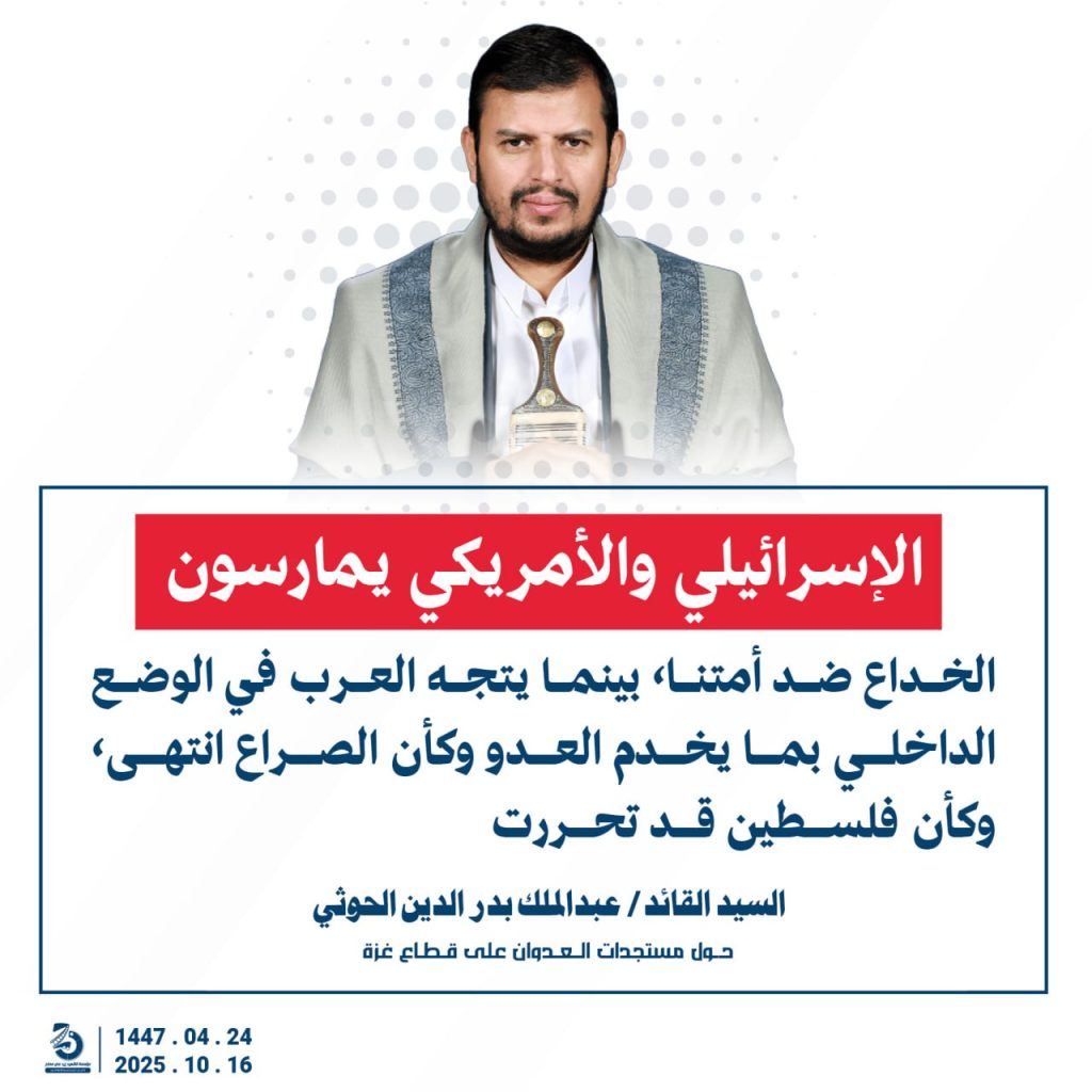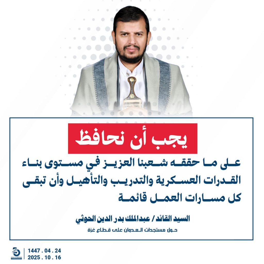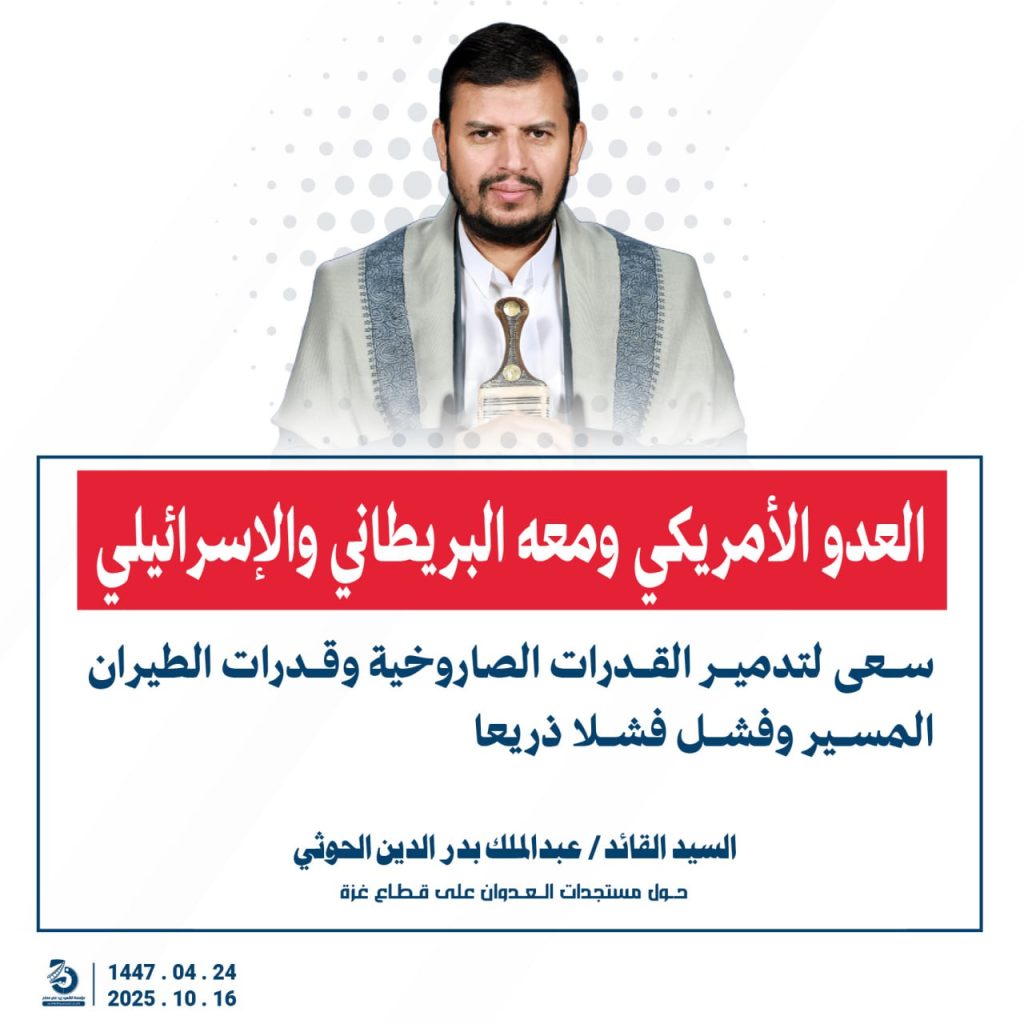 مقتطفات من كلمة السيد القائد عبدالملك بدرالدين الحوثي “حفظه الله”حول المستجدات في قطاع غزة والتطورات الاقليمية والدولية 24 ربيع الآخر 1447هـ | 16 أكتوبر 2025م