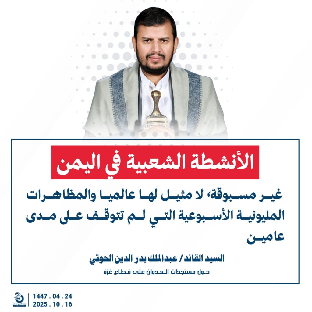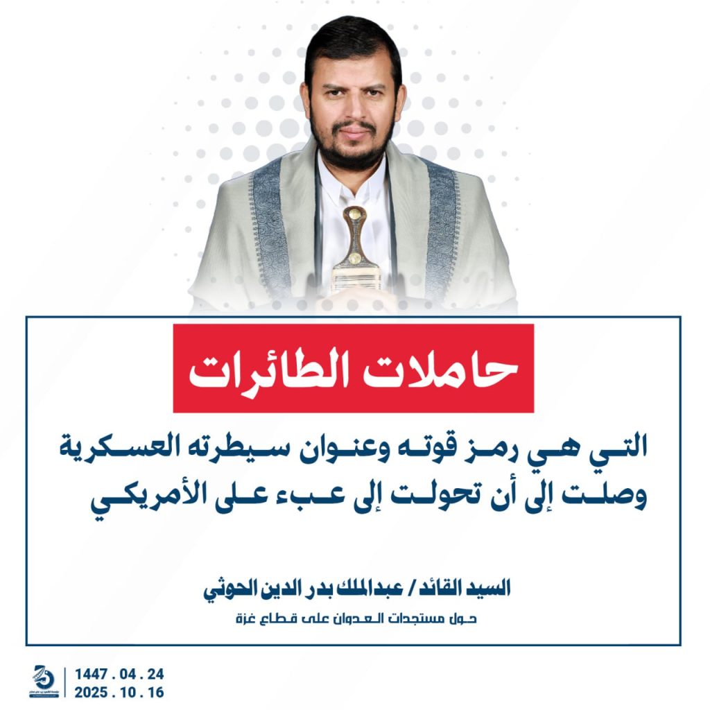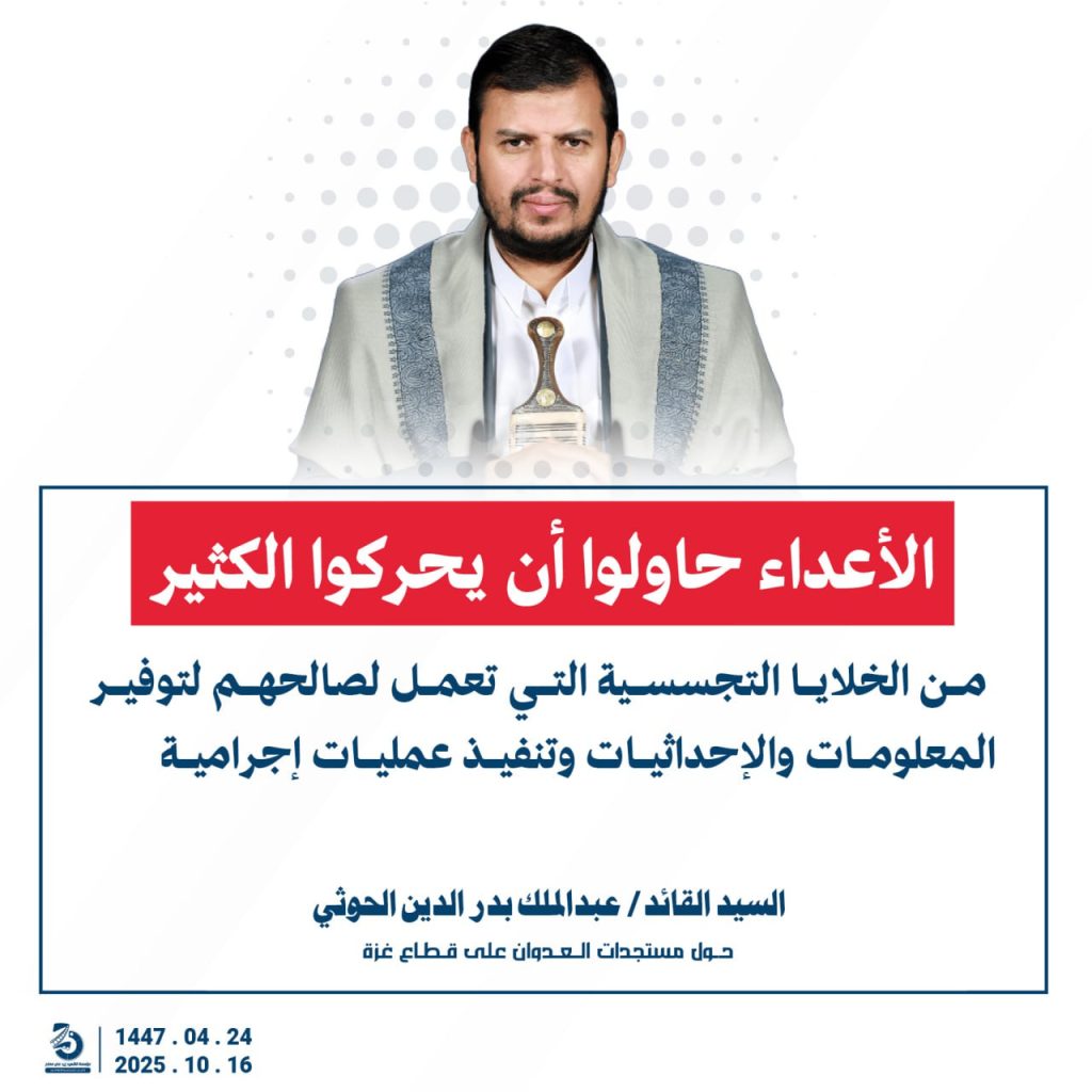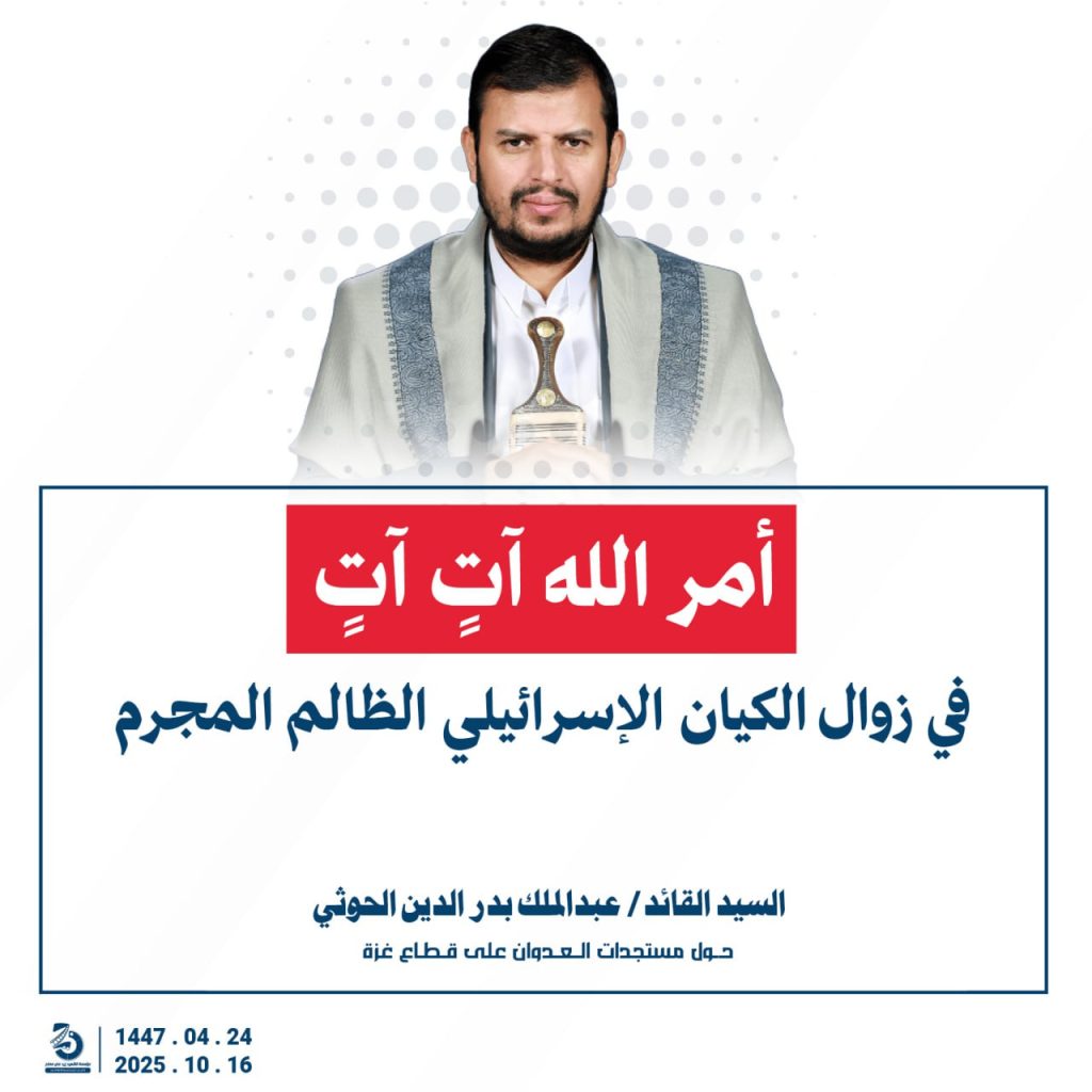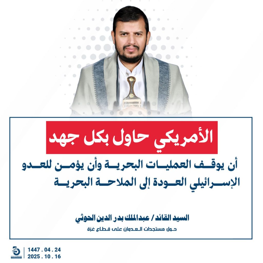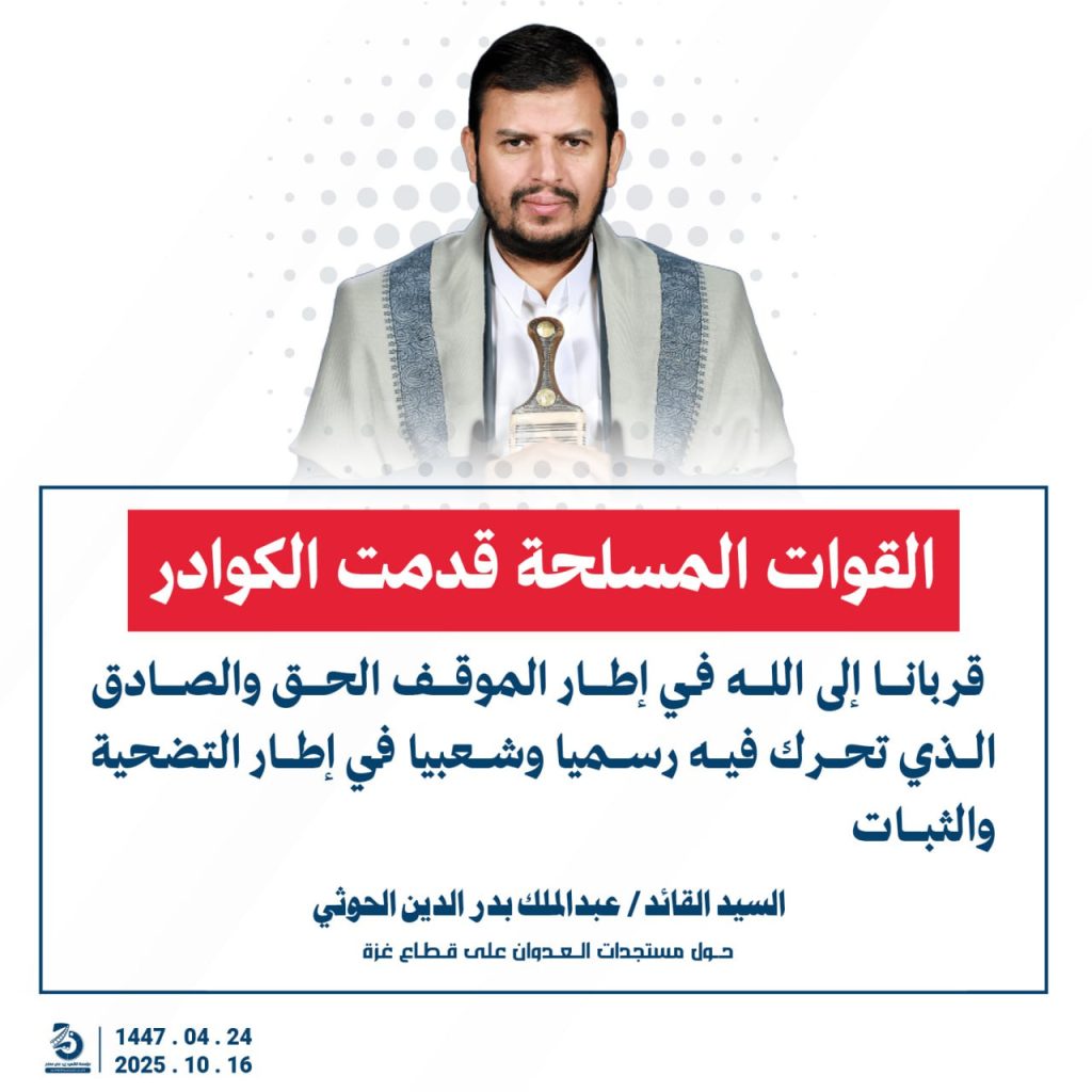 مقتطفات من كلمة السيد القائد عبدالملك بدرالدين الحوثي “حفظه الله”حول المستجدات في قطاع غزة والتطورات الاقليمية والدولية 24 ربيع الآخر 1447هـ | 16 أكتوبر 2025م