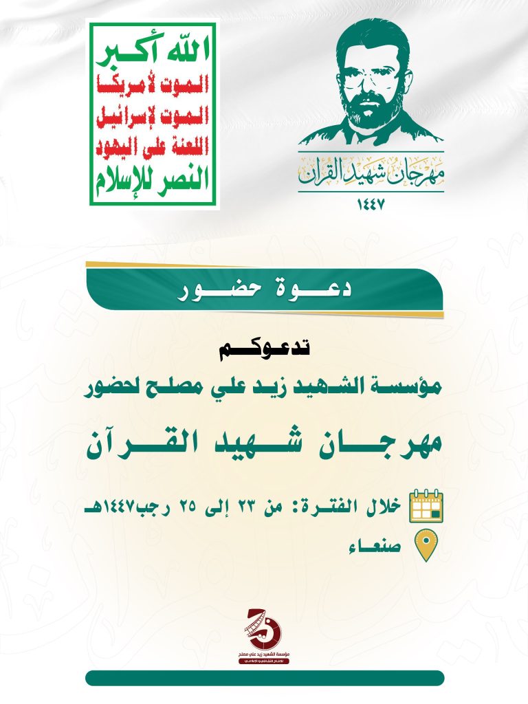 تنظم #مؤسسة_الشهيد_زيد_علي_مصلح فعاليات مهرجان شهيد القرآن، من 23 الى 25 رجب 1447هـ