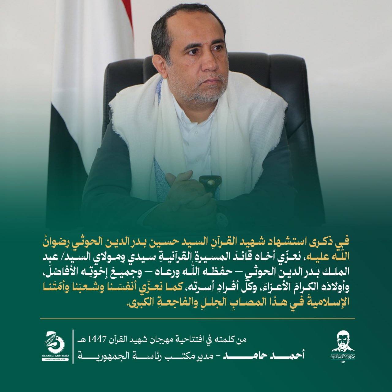 Return to "مقتطفات|من كلمة مدير مكتب رئاسة الجمهورية أحمد حامد في مهرجان شهيد القرآن في موسمه الأول" 1 التالي