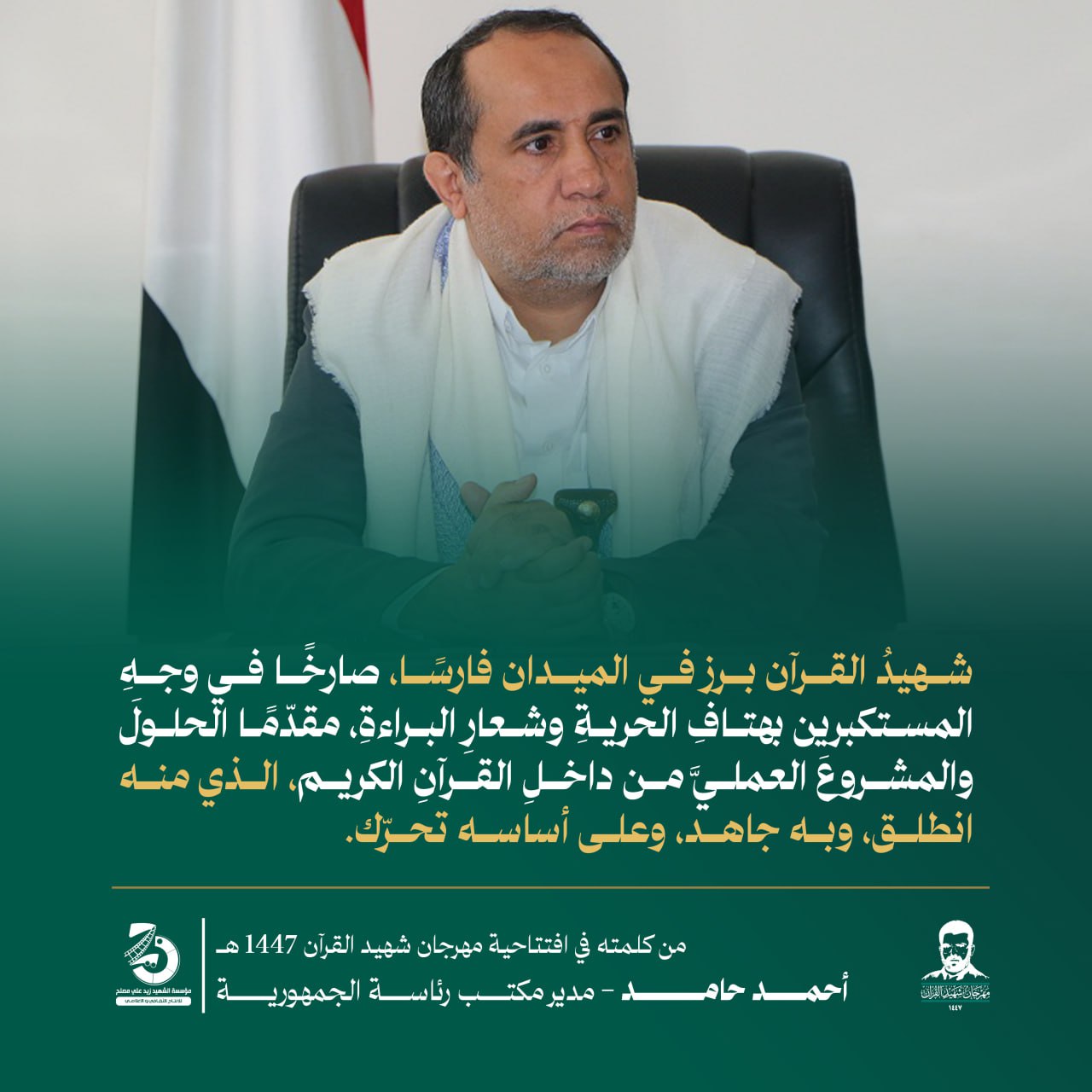 Return to "مقتطفات|من كلمة مدير مكتب رئاسة الجمهورية أحمد حامد في مهرجان شهيد القرآن في موسمه الأول" 3 التالي السابق