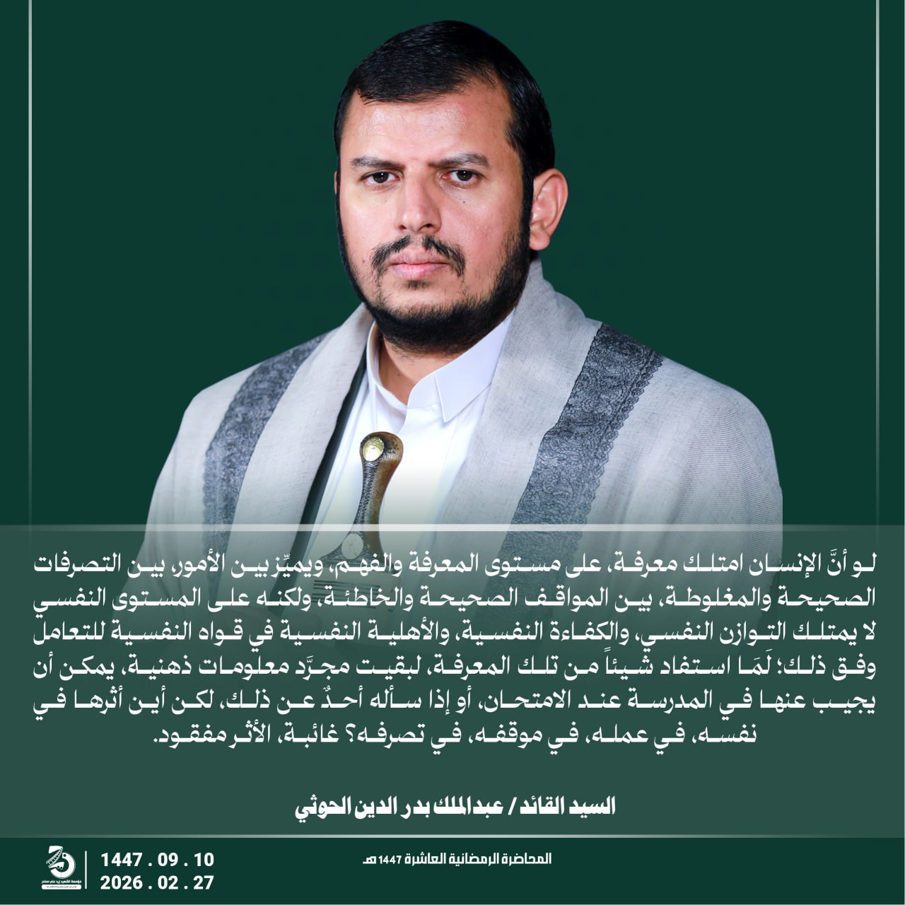 Return to "مقتطفات من المحاضرة الرمضانية العاشرة للسيد القائد عبدالملك بدر الدين الحوثي يحفظه الله . 10رمضان…" لو ان الانسان امتلك المعرفة على مستوى المعرفة والفهم التالي السابق