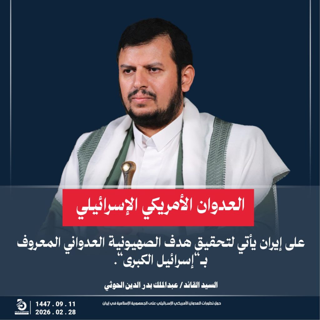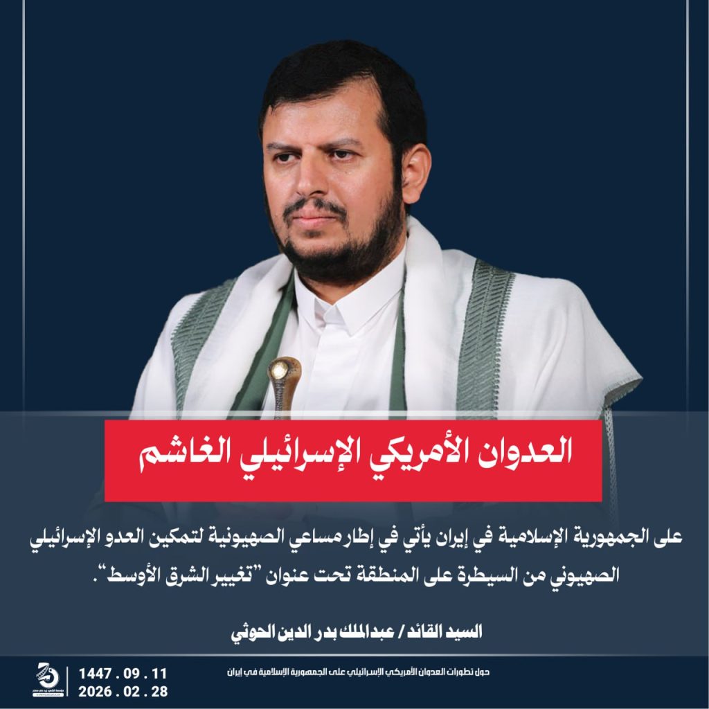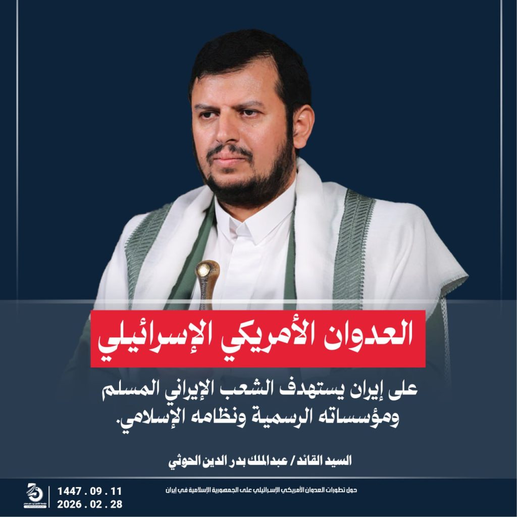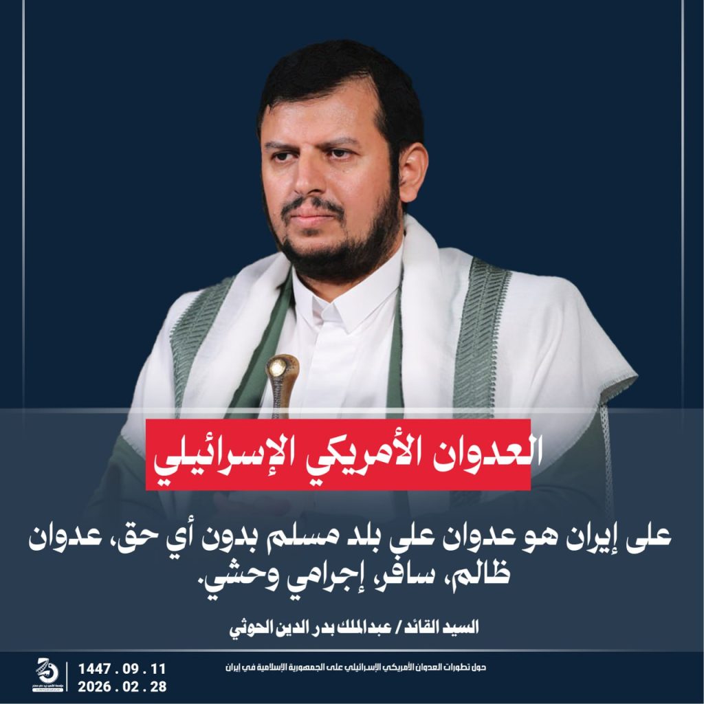 مقتطفات من كلمة السيد القائد عبدالملك بدرالدين الحوثي حول العدوان الأمريكي الإسرائيلي على الجمهورية الإسلامية في إيران – 11 رمضان 1447هـ | 28 فبراير 2026م فبراير 28, 2026 اسرائيلالاماراتالبحرينالسعوديةالسيد القائد عبدالملك الحوثيالعدوان على ايراناليمنامريكا FacebookTwitterTelegramWhatsApp