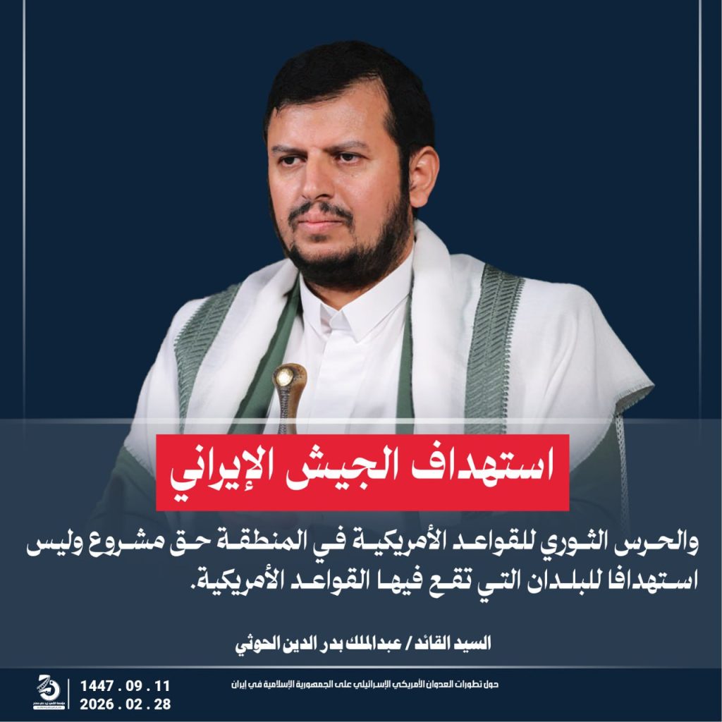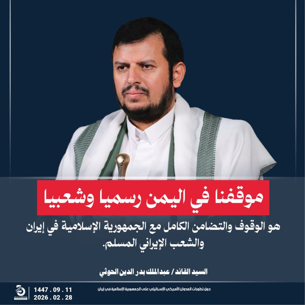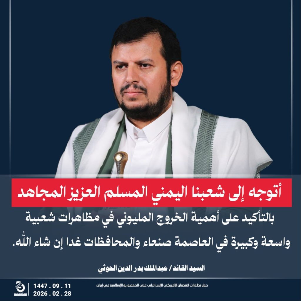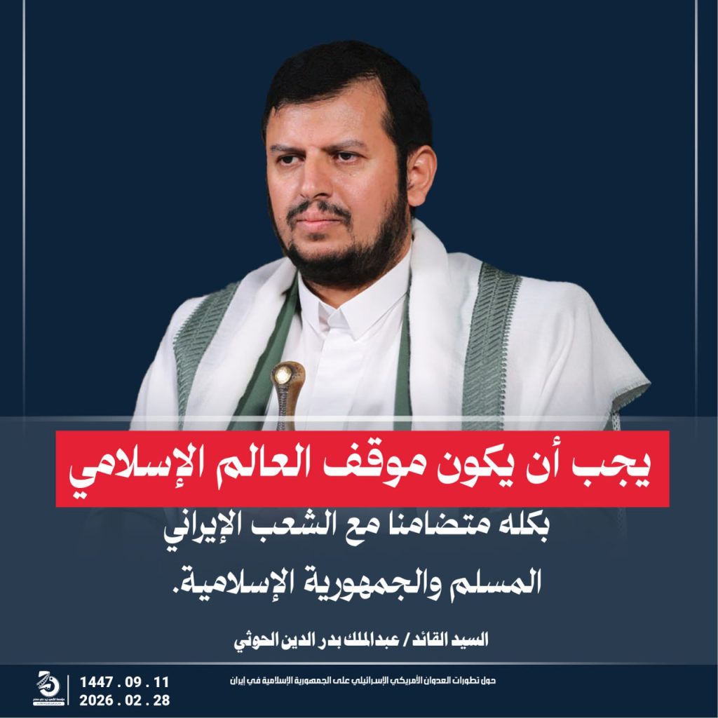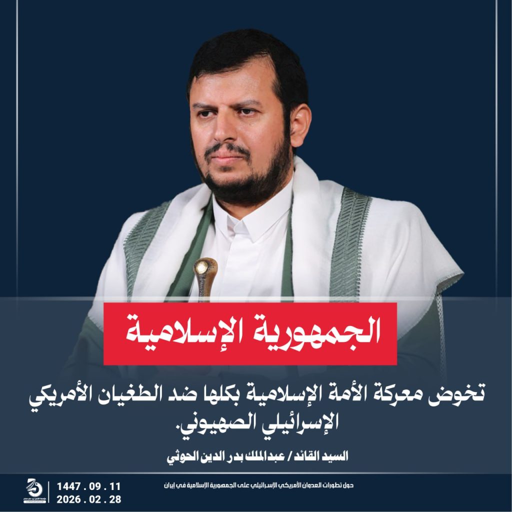 مقتطفات من كلمة السيد القائد عبدالملك بدرالدين الحوثي حول العدوان الأمريكي الإسرائيلي على الجمهورية الإسلامية في إيران – 11 رمضان 1447هـ | 28 فبراير 2026م فبراير 28, 2026 اسرائيلالاماراتالبحرينالسعوديةالسيد القائد عبدالملك الحوثيالعدوان على ايراناليمنامريكا FacebookTwitterTelegramWhatsApp