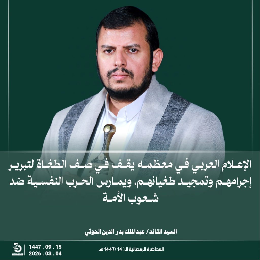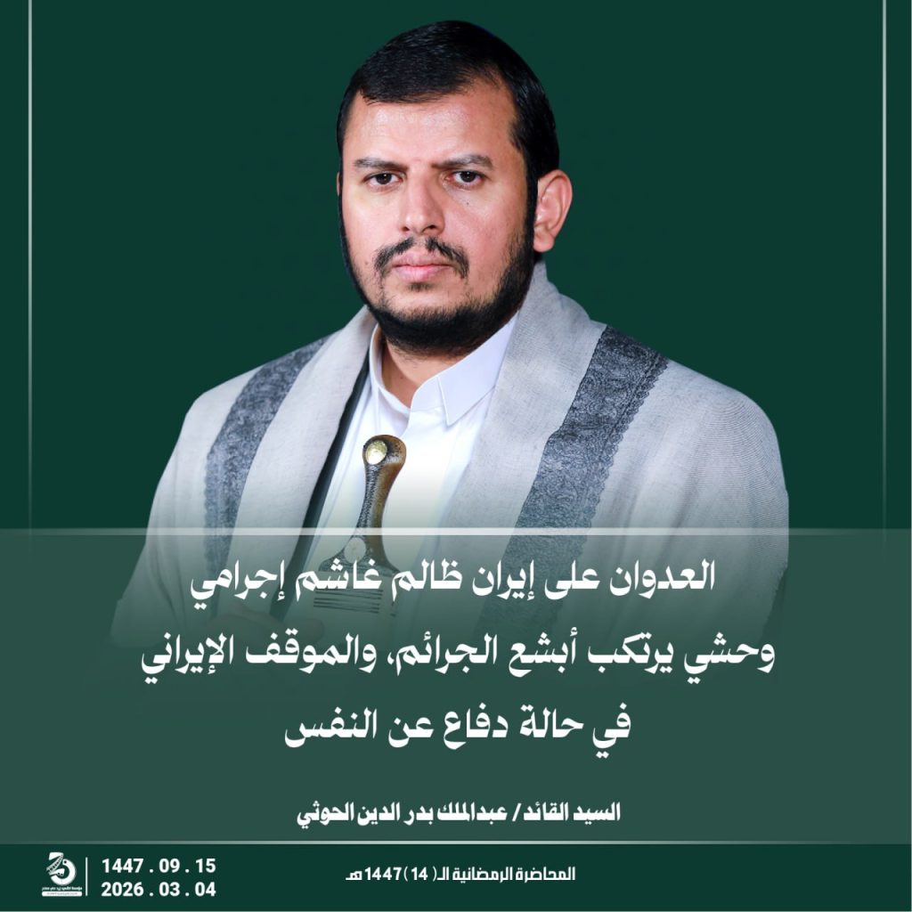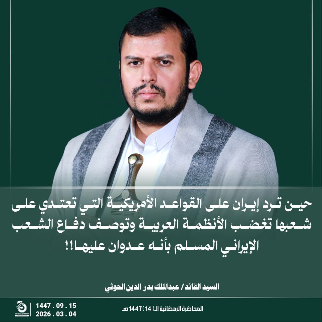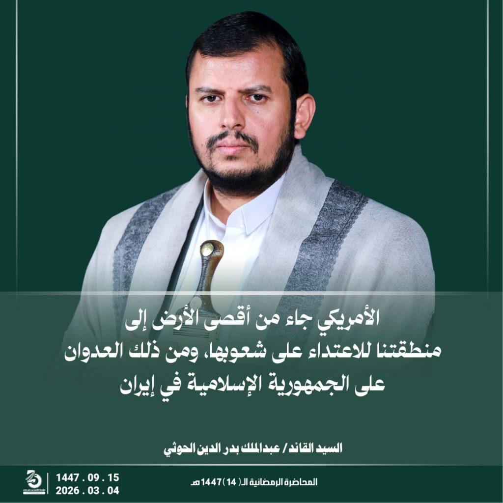 مقتطفات من المحاضرة الرمضانية الخامسة عشرة للسيد القائد عبدالملك بدرالدين الحوثي 15 رمضان 1447هـ 04 مارس 2026م مارس 5, 2026 اسرائيلالاماراتالسعوديةاليمنامريكاايراندول الخليجطهران FacebookTwitterTelegramWhatsApp