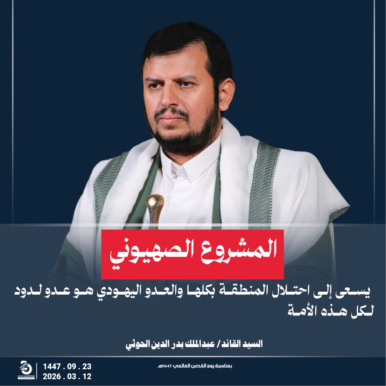 Return to "مقتطفات من كلمة السيد القائد عبدالملك بدر الدين الحوثي يحفظه الله بمناسبة يوم القدس العالمي 23 رمضان…" المشروع الصهيوني يسعى إلى احتلال المنطقة بكلها والعدو اليهودي هو عدو لدود لكل هذه الأمة التالي السابق