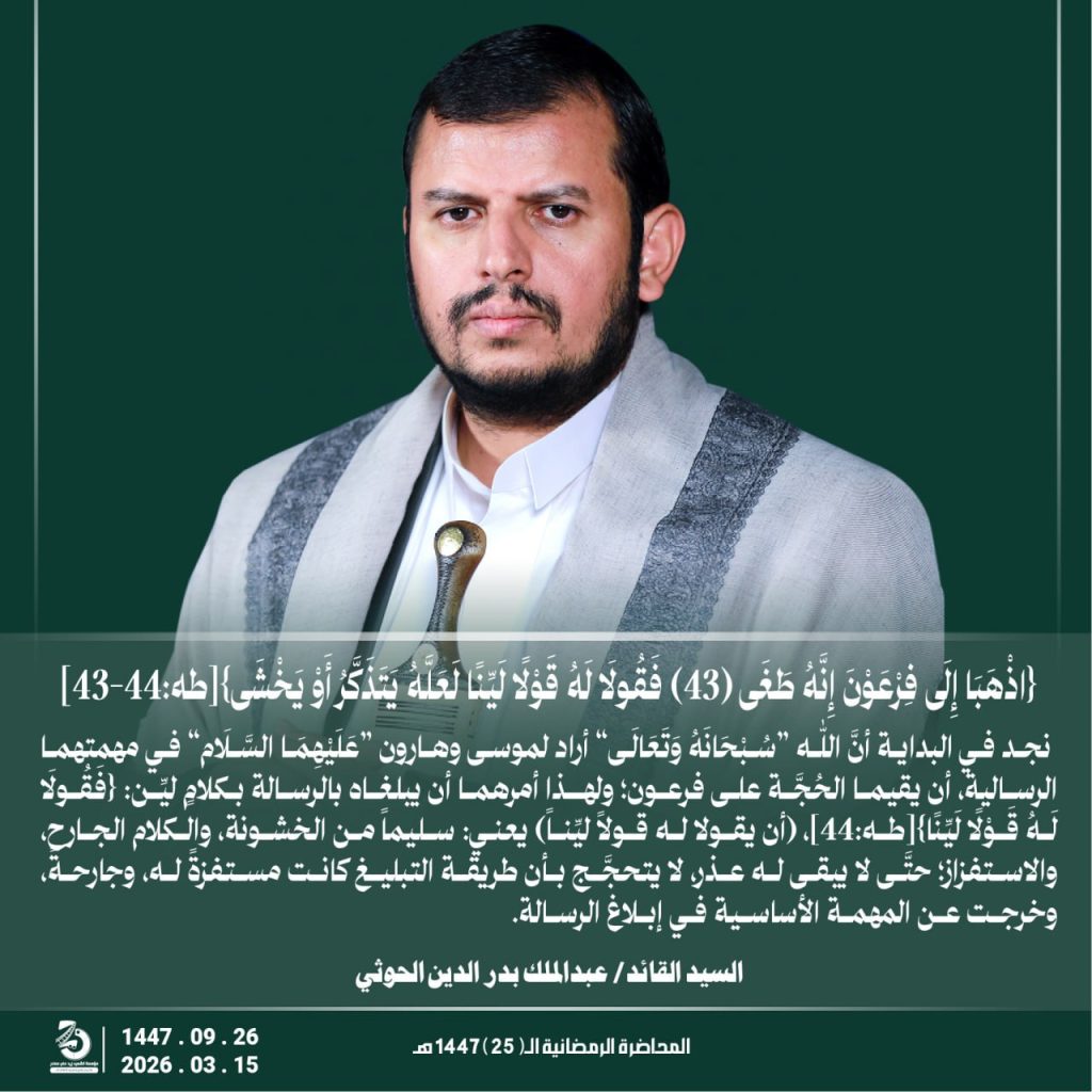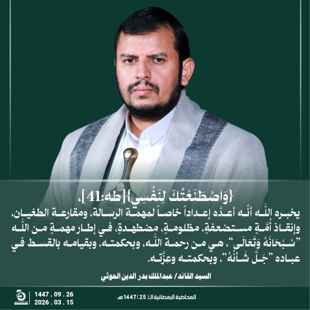 مقتطفات من المحاضرة الرمضانية الخامسة والعشرون للسيد القائد عبدالملك بدرالدين الحوثي 26 رمضان 1447هـ 15 مارس 2026م مارس 15, 2026 السيد عبدالملك الحوثيالقصص القرآنيةرمضان كريمشهر الإحسانشهر التقوىقصة موسى FacebookTwitterTelegramWhatsApp