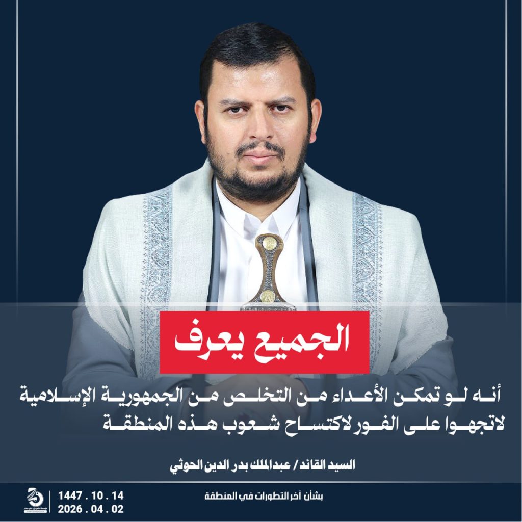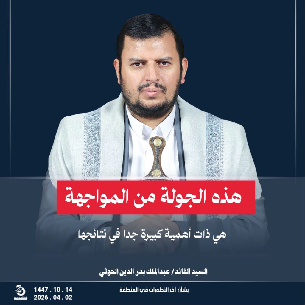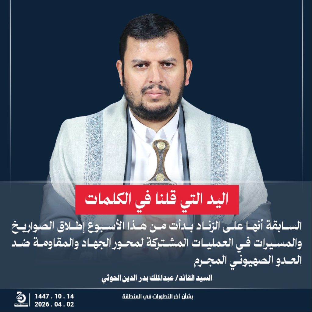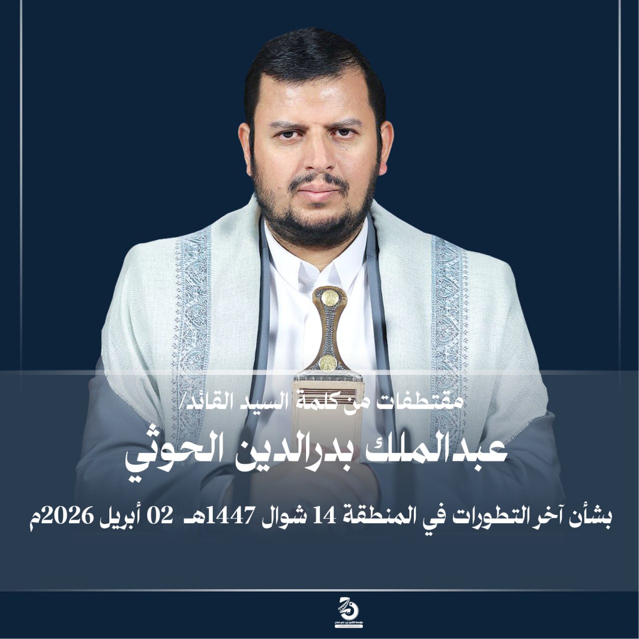 مقتطفات من كلمة السيد القائد عبدالملك بدر الدين الحوثي “يحفظه الله” بشأن آخر التطورات في المنطقة. 14 شوال 1447هـ | 02 أبريل 2026م أبريل 2, 2026 اسرائيلالاماراتالسعوديةالعدوان على ايرانالوعد الصادق4اليمنامريكاايران FacebookTwitterTelegramWhatsApp