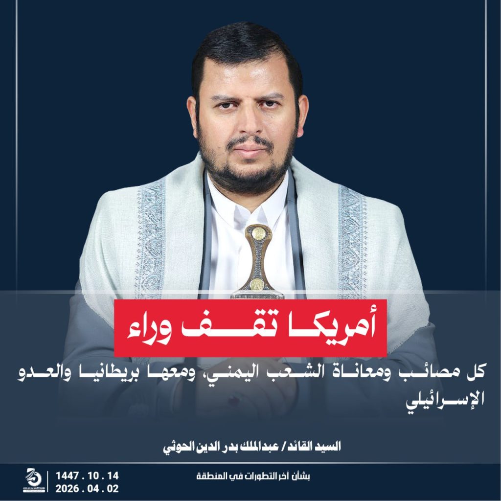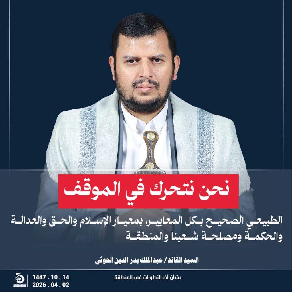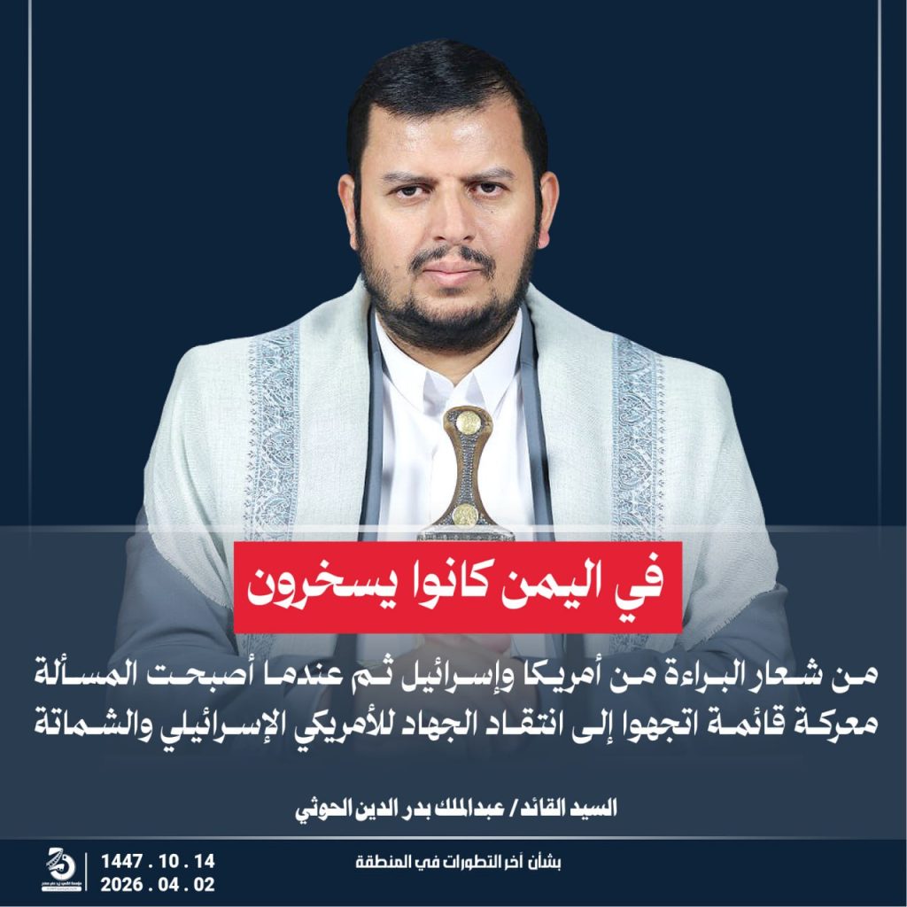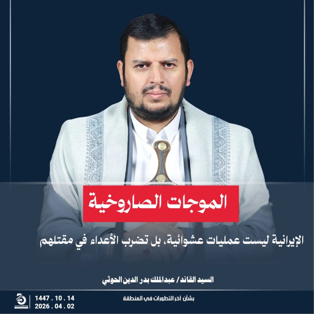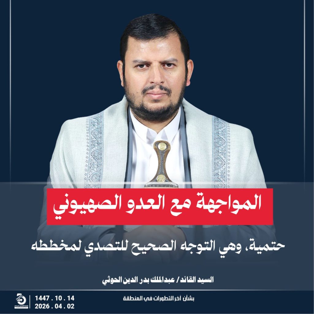 مقتطفات من كلمة السيد القائد عبدالملك بدر الدين الحوثي “يحفظه الله” بشأن آخر التطورات في المنطقة. 14 شوال 1447هـ | 02 أبريل 2026م أبريل 2, 2026 اسرائيلالاماراتالسعوديةالعدوان على ايرانالوعد الصادق4اليمنامريكاايران FacebookTwitterTelegramWhatsApp