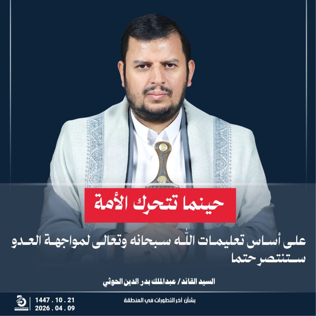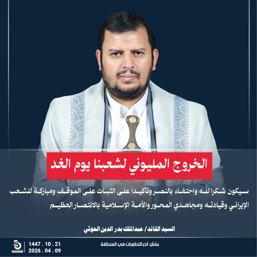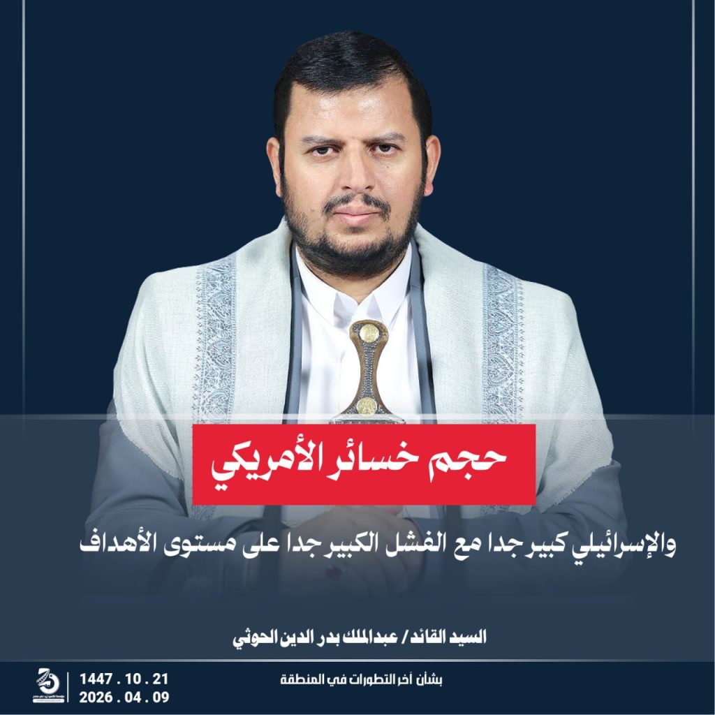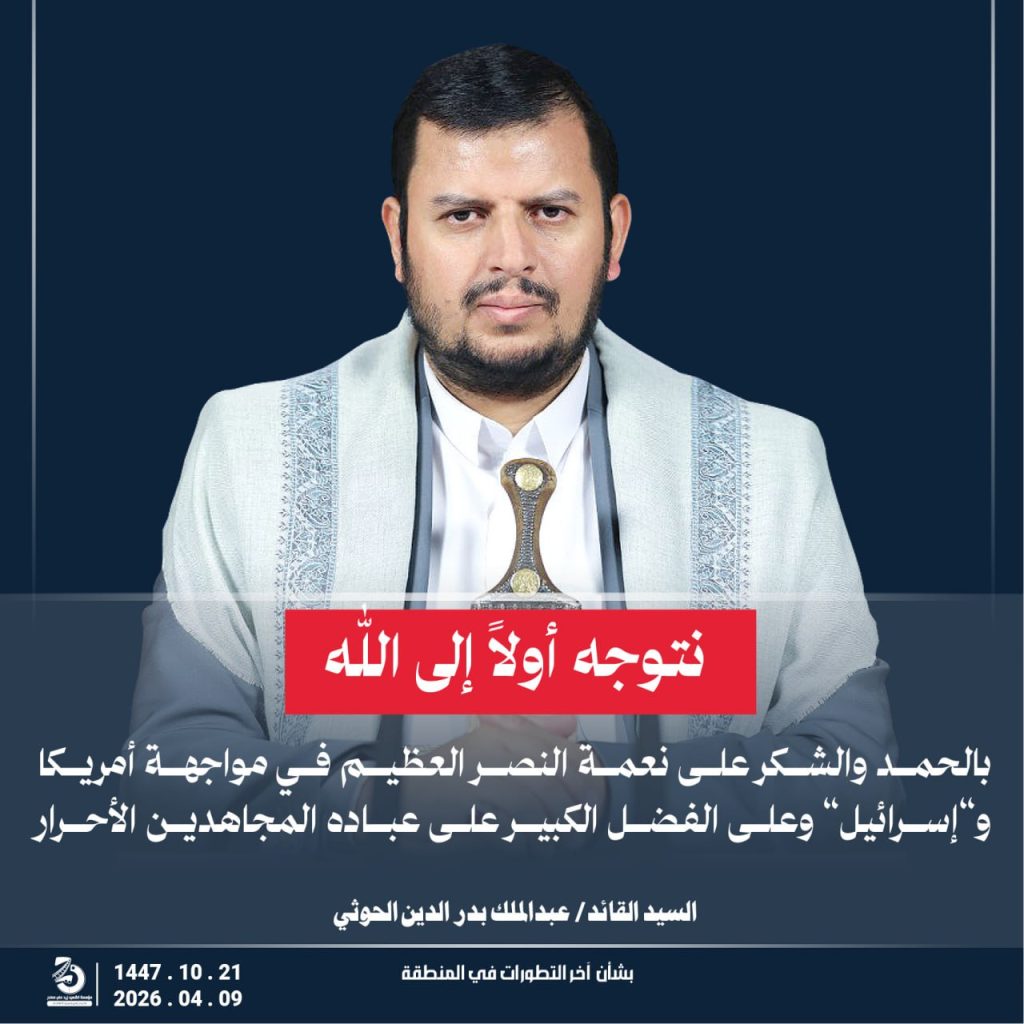 مقتطفات من كلمة السيد القائد عبدالملك بدر الدين الحوثي “يحفظه الله” حول أخر التطورات والمستجدات . 21 شوال 1447هـ | 09 أبريل 2026م أبريل 9, 2026 أمريكاإسرائيلإيرانالشعب اليمنياليمنحزب اللهطهرانلبنان FacebookTwitterTelegramWhatsApp