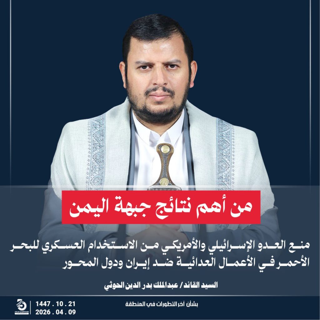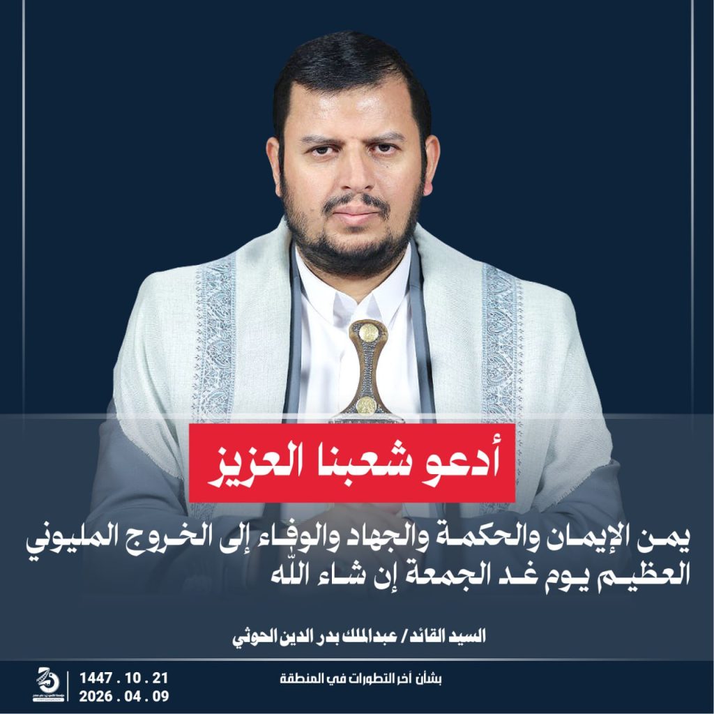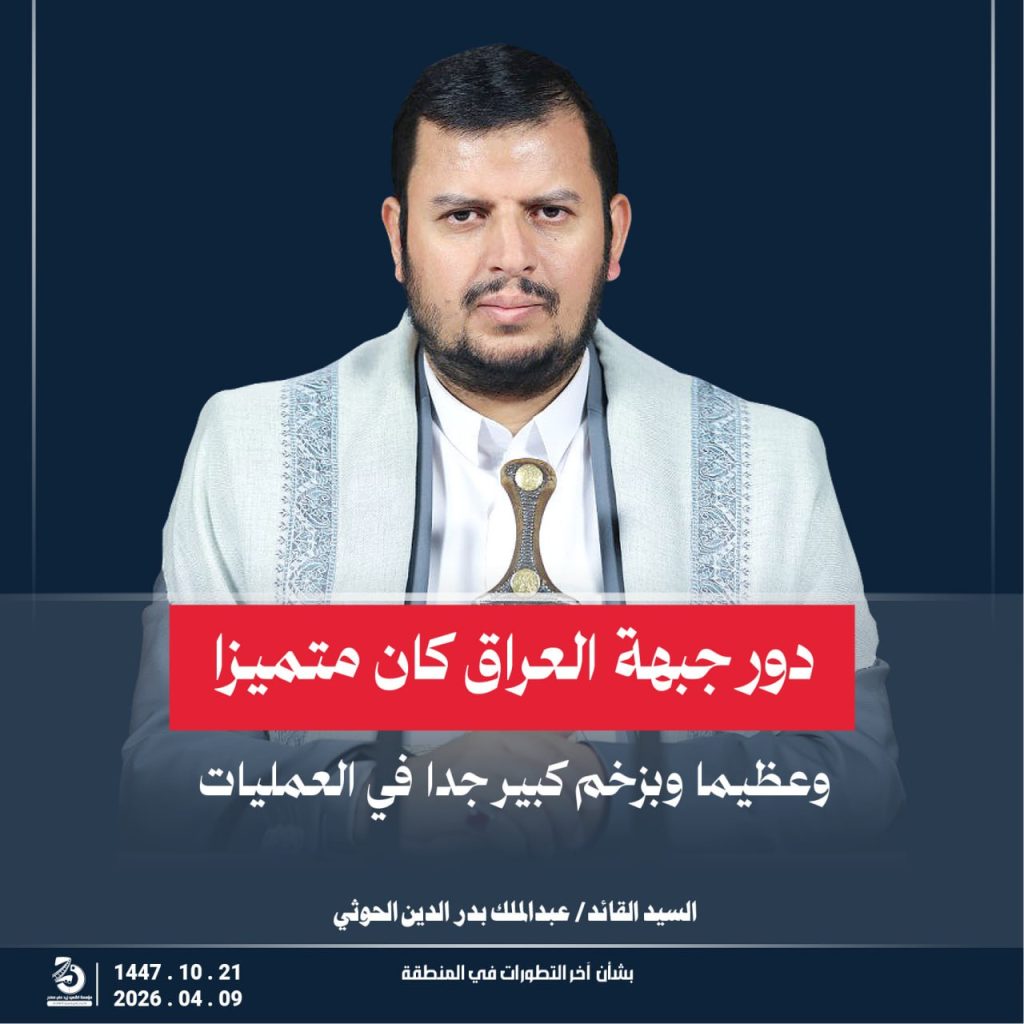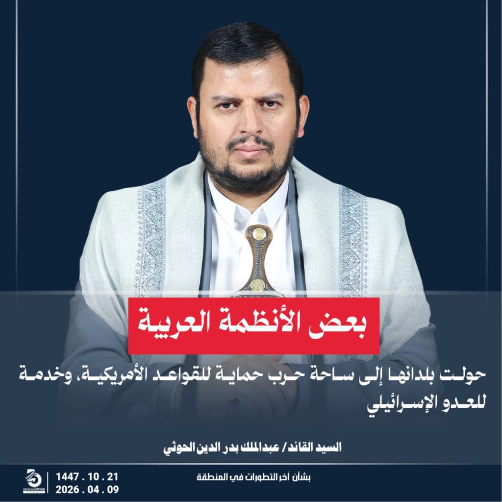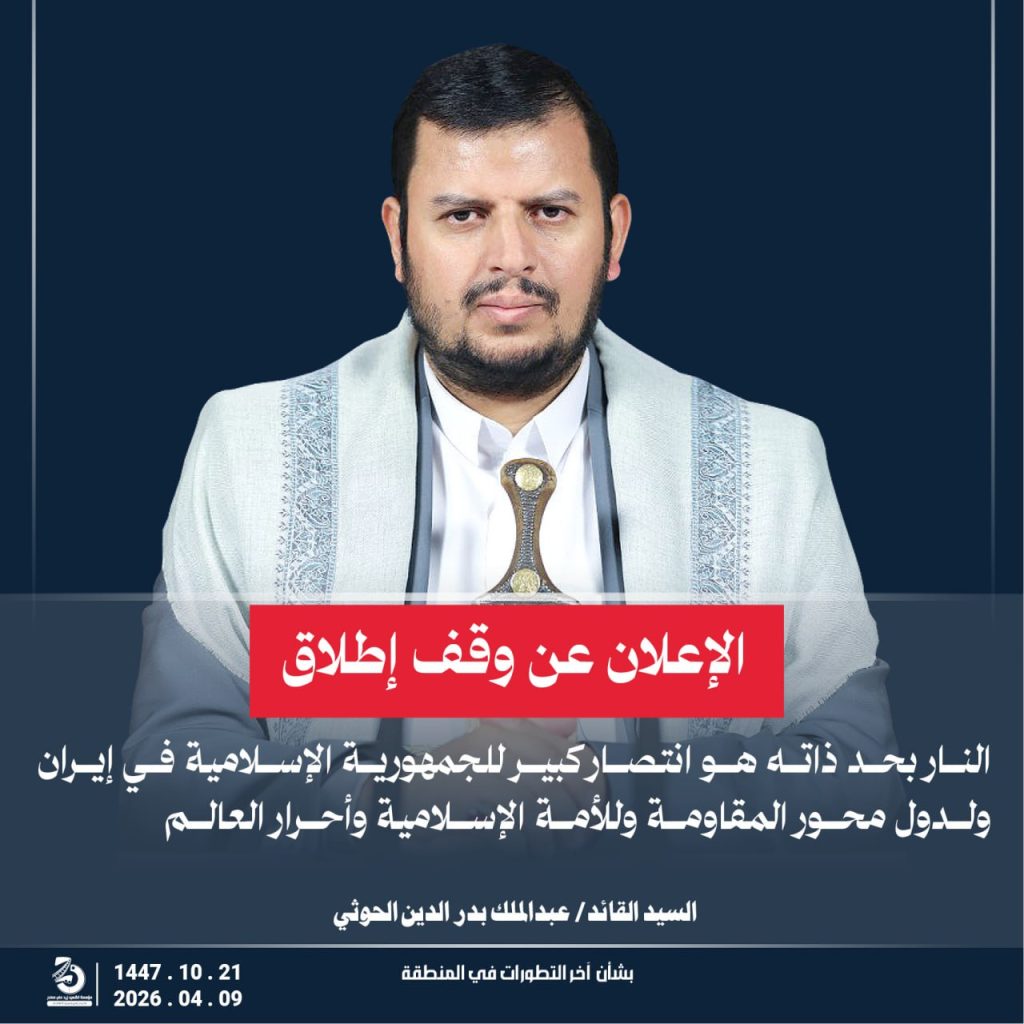 مقتطفات من كلمة السيد القائد عبدالملك بدر الدين الحوثي “يحفظه الله” حول أخر التطورات والمستجدات . 21 شوال 1447هـ | 09 أبريل 2026م أبريل 9, 2026 أمريكاإسرائيلإيرانالشعب اليمنياليمنحزب اللهطهرانلبنان FacebookTwitterTelegramWhatsApp