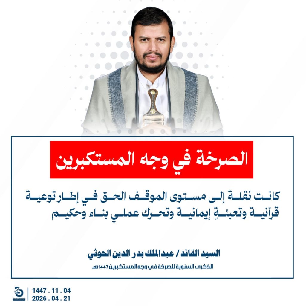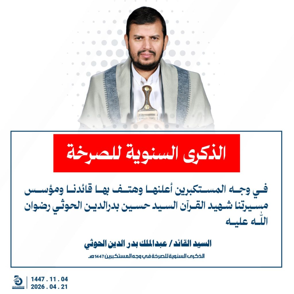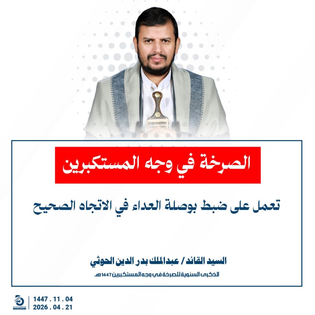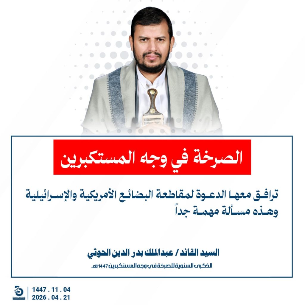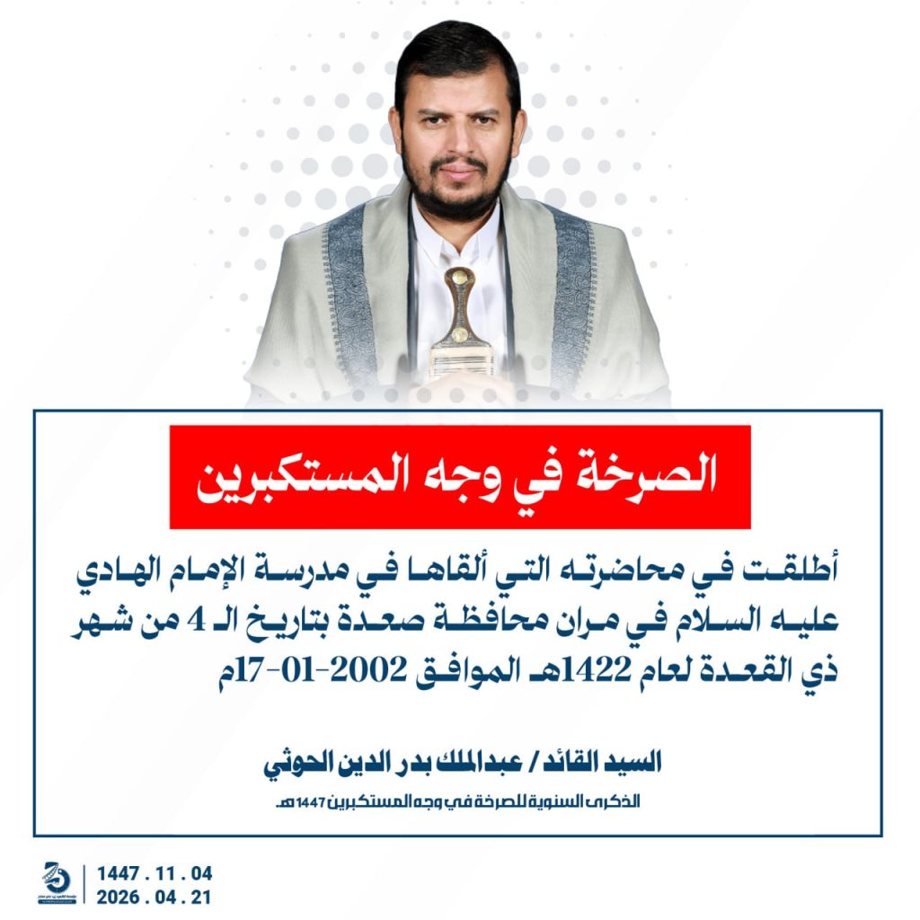 مقتطفات من كلمة السيد القائد عبدالملك بدرالدين الحوثي بمناسبة الذكرى السنوية للصرخة في وجه المستكبرين 04 ذو القعدة 1447هـ 21 أبريل 2026م أبريل 21, 2026 أمريكاإسرائيلإيرانالحصار البحريالسفن البحريةالسيد عبدالملك الحوثيالشرق الاوسطالشعار سلاح وموقف FacebookTwitterTelegramWhatsApp