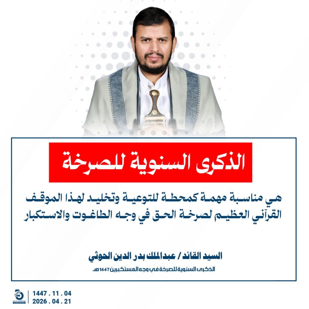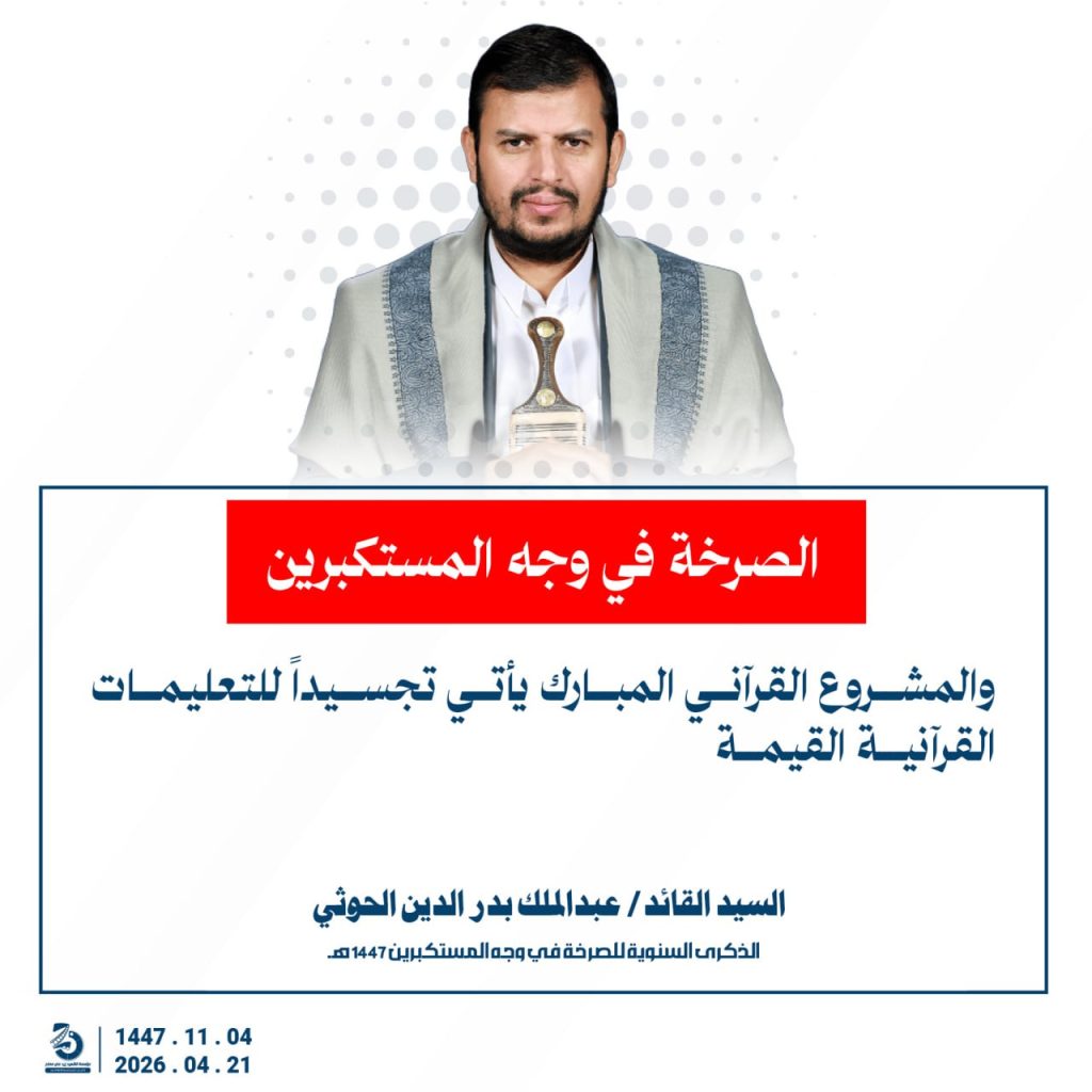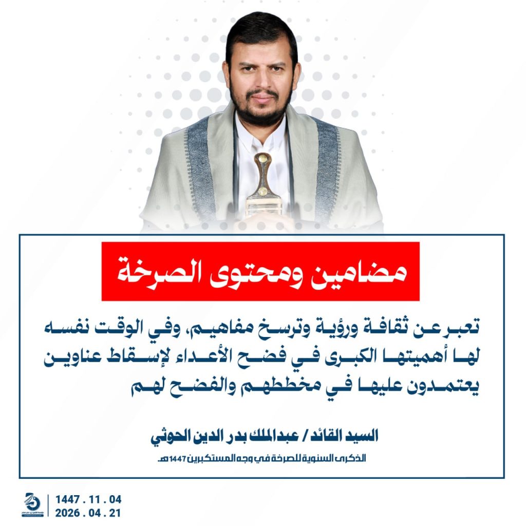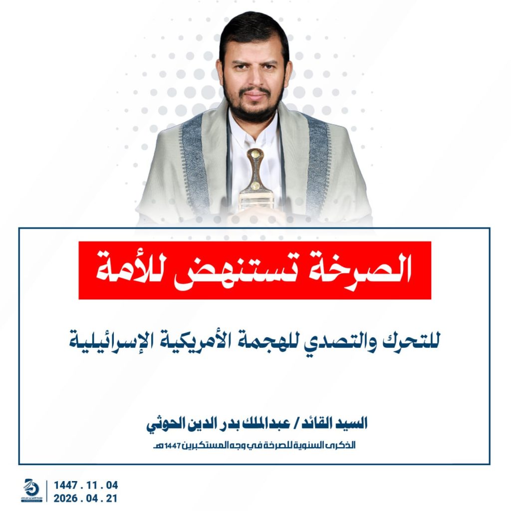 مقتطفات من كلمة السيد القائد عبدالملك بدرالدين الحوثي بمناسبة الذكرى السنوية للصرخة في وجه المستكبرين 04 ذو القعدة 1447هـ 21 أبريل 2026م أبريل 21, 2026 أمريكاإسرائيلإيرانالحصار البحريالسفن البحريةالسيد عبدالملك الحوثيالشرق الاوسطالشعار سلاح وموقف FacebookTwitterTelegramWhatsApp