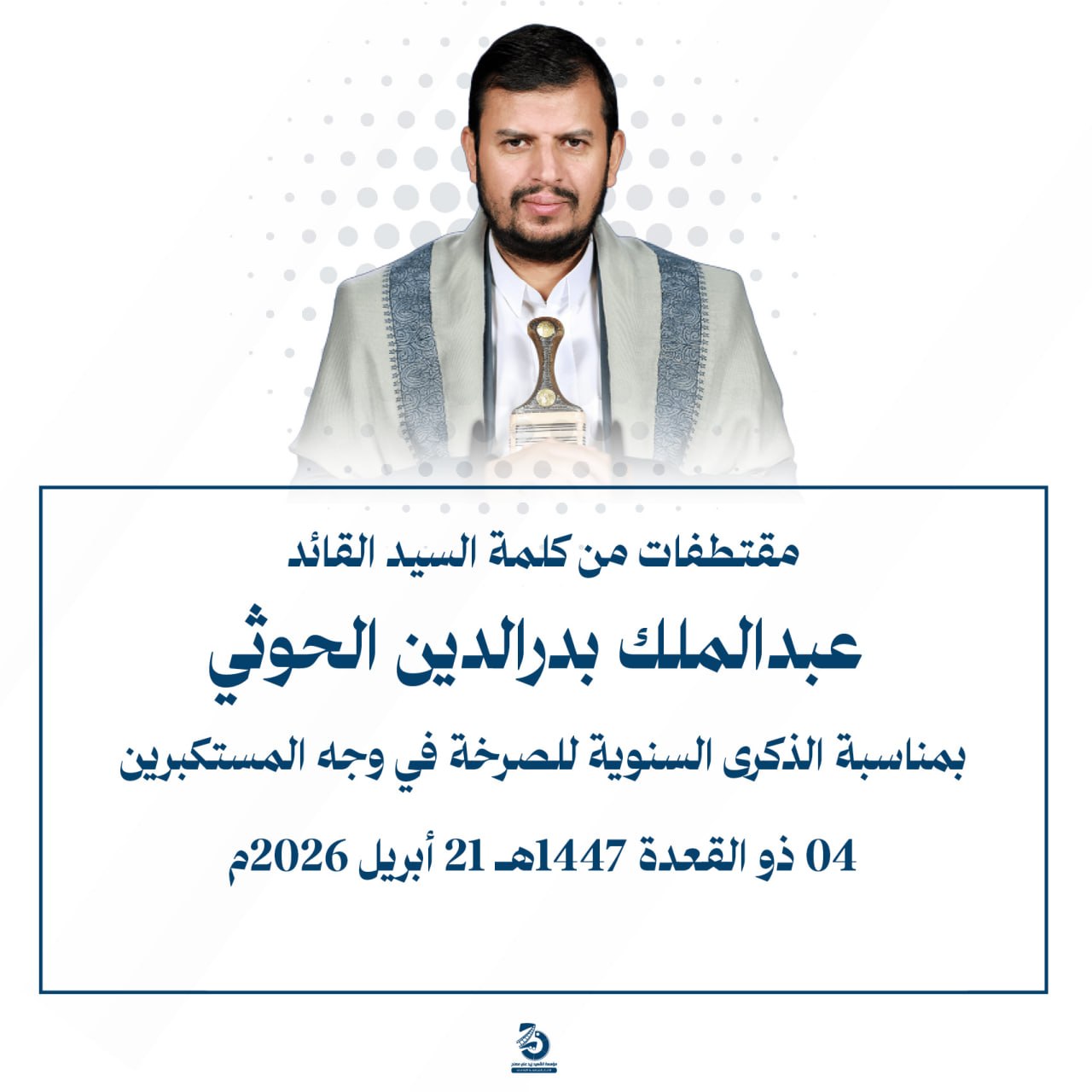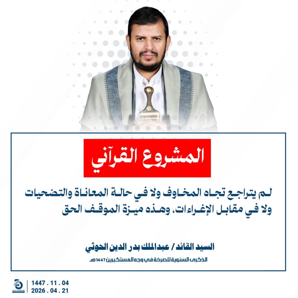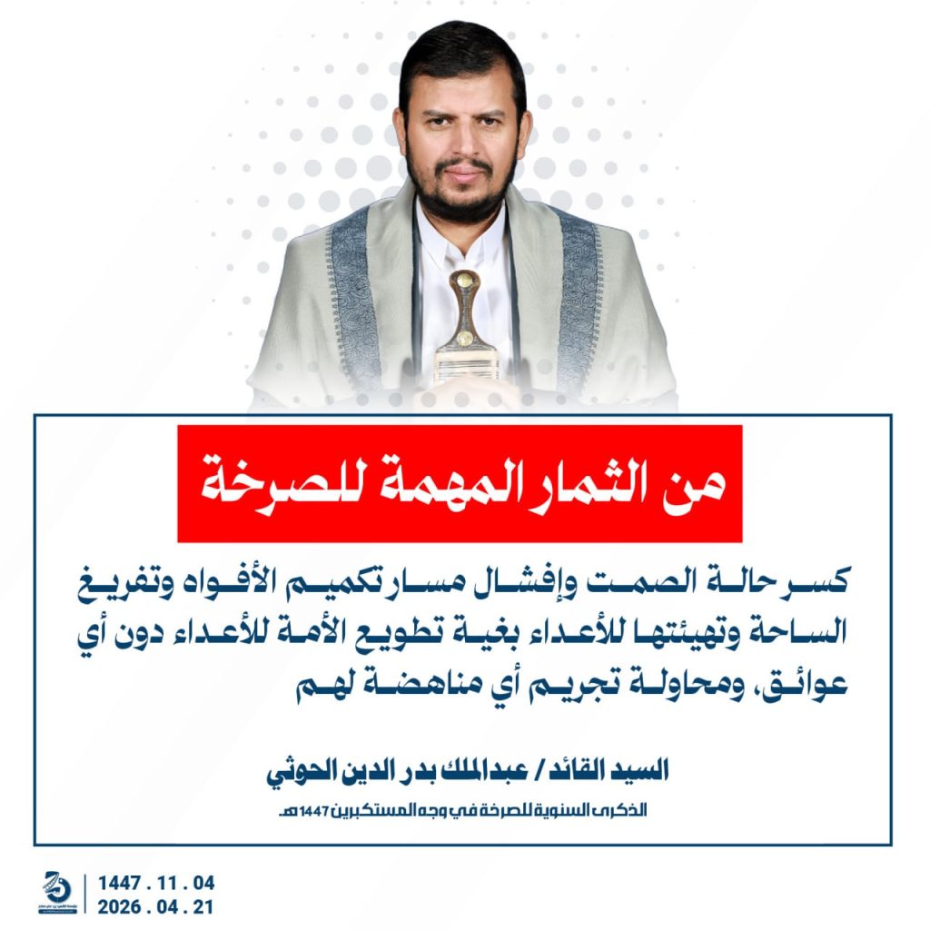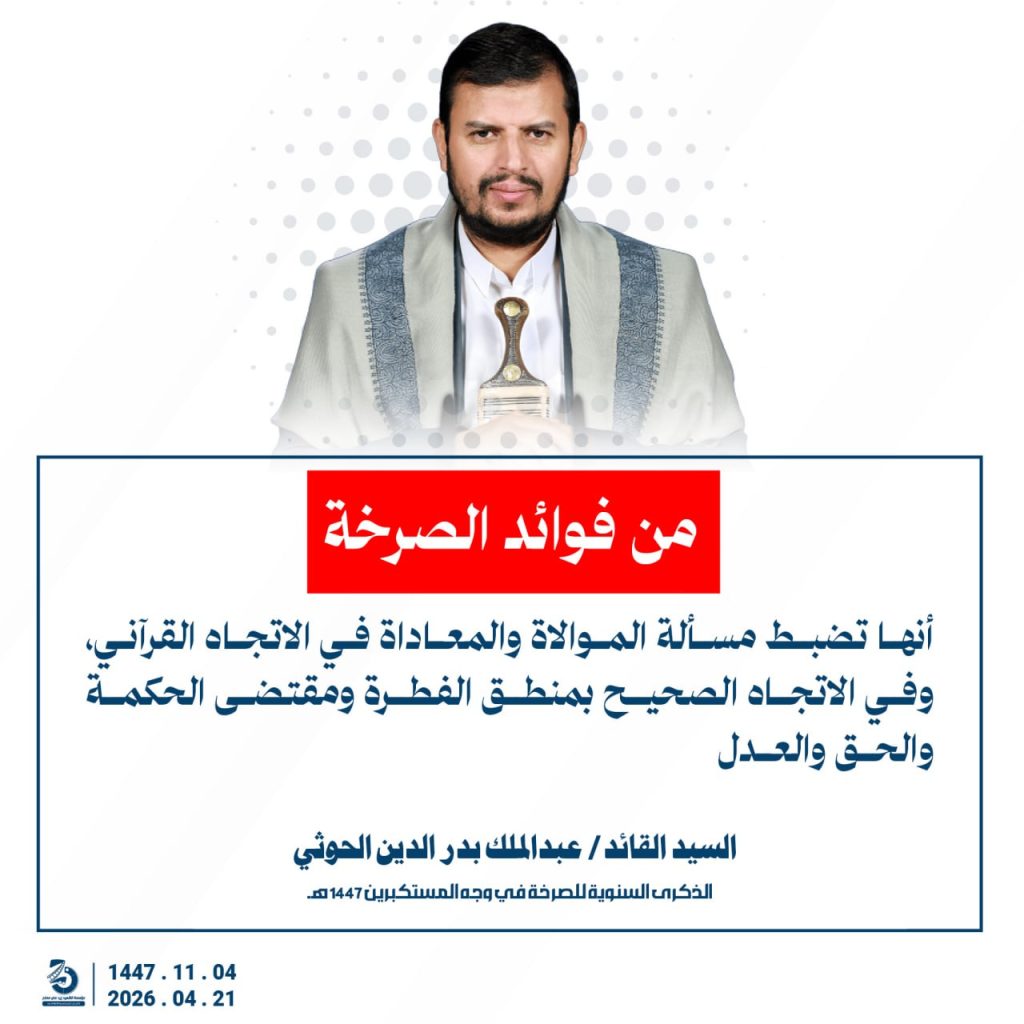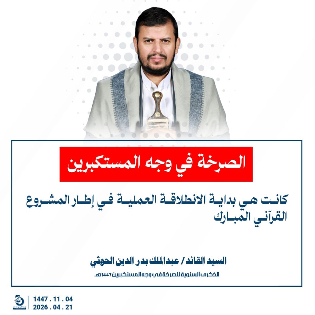 مقتطفات من كلمة السيد القائد عبدالملك بدرالدين الحوثي بمناسبة الذكرى السنوية للصرخة في وجه المستكبرين 04 ذو القعدة 1447هـ 21 أبريل 2026م أبريل 21, 2026 أمريكاإسرائيلإيرانالحصار البحريالسفن البحريةالسيد عبدالملك الحوثيالشرق الاوسطالشعار سلاح وموقف FacebookTwitterTelegramWhatsApp