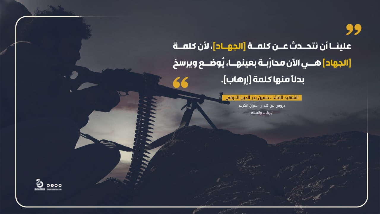 كلمة الجهاد يونيو 15, 2022 علينا أن نتحدث عن كلمة [الجهاد]، لأن كلمة [الجهاد] هـي الآن محارَبـة بعينهـا، يُوضـع ويرسخ بدلاً منها كلمة [إرهاب]. الشهيد القائد حسين بدر الدين الحوثي FacebookTwitterTelegramWhatsApp