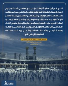 الحج في أول عملية لإعادته إلى حج إسلامي إنما كان يوم أرسل الرسول (صلوات الله عليه وعلى آله) علي بن أبي طالب (صلوات الله عليه) ليعلن البراءة من المشركين بتلك العشر الآيات الأولى من سورة براءة، ليعلن البراءة من المشركين، بل ليعلن الحرب على المشركين وليس فقط البراءة منهم. كانت تلك هي أول عملية لتحويل الحج إلى حج إسلامي، وصبغه بصبغة توحي بالأهداف المقصودة من وراء تلك العبادة العظيمة التي هي الحج