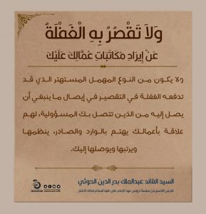 وَلاَ تَقْصُرُ بِهِ الْغَفْلَةُ عَنْ إِيرَادِ مُكَاتَبَاتِ عُمَّالِكَ عَلَيْكَ يوليو 13, 2022 FacebookTwitterTelegramWhatsApp
