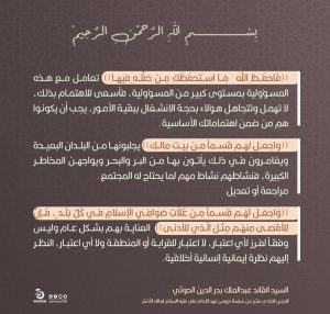 فَاحفَظِ اللّه َ مَا استَحفَظَكَ مِن حَقِّهِ يوليو 15, 2022 فَاحفَظِ اللّه َ مَا استَحفَظَكَ مِن حَقِّهِ فيها واجعل لهم قسماً من بيت مالك وَاجعَل لَهُم قِسماً مِن غَلّاتِ صَوافِي الإِسلامِ في كُلِّ بَلَدٍ ، فَإِنَّ لِلأَقصى مِنهُم مِثلَ الَّذي لِلأَدنى FacebookTwitterTelegramWhatsApp