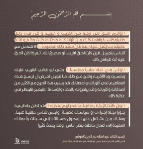 وَأَلزِمِ الحَقّ مَن لَزِمَهُ مِنَ القَرِیبِ وَ البَعِیدِ وَ کُن فِی ذَلِکَ صَابِراًمُحْتَسِباً وَاقِعاً ذَلِکَ مِنْ قَرَابَتِکَ وَ خَاصَّتِکَ حَیْثُ وَقَعَ وَ ابْتَغِ عَاقِبَتَهُ بِمَا یَثْقُلُ عَلَیْکَ مِنْهُ فَإِنَّ مَغَبَّهَ ذَلِکَ مَحْمُودَهٌ.