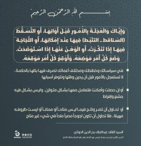 وَإِيَّاكَ وَالْعَجَلَةَ بِالاُْمُورِ قَبْلَ أَوَانِهَا، أَوِ التَّسَقُّطَ (السَناقط ـ التثبّط) فِيهَا عِنْدَ إِمْكَانِهَا، أَوِ اللَّجَاجَةَ فِيهَا إِذَا تَنَكَّرَتْ، أَوِ الْوَهْنَ عَنْهَا إِذَا اسْتَوْضَحَتْ. وَضَعْ كُلَّ أَمْر مَوْضِعَهُ، وَأَوْقِعْ كُلَّ أَمْر مَوْقِعَهُ.