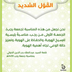 مناسبة أول جمعة رجب رئيسية لترسيخ الهوية، والحفاظ علي الهوية، وتعزيز حالة الوعي تجاه أهمية الهوية يناير 26, 2023 FacebookTwitterTelegramWhatsApp